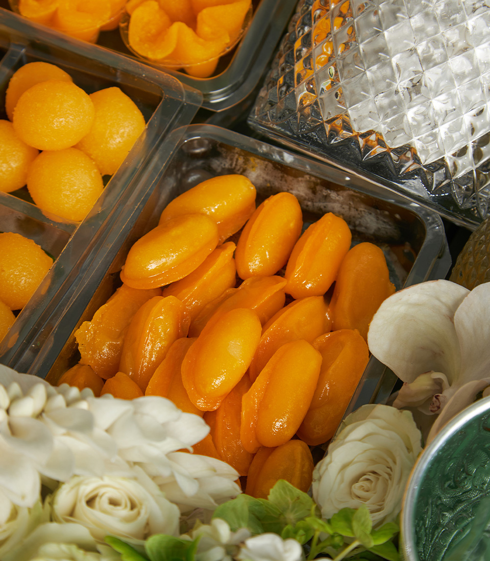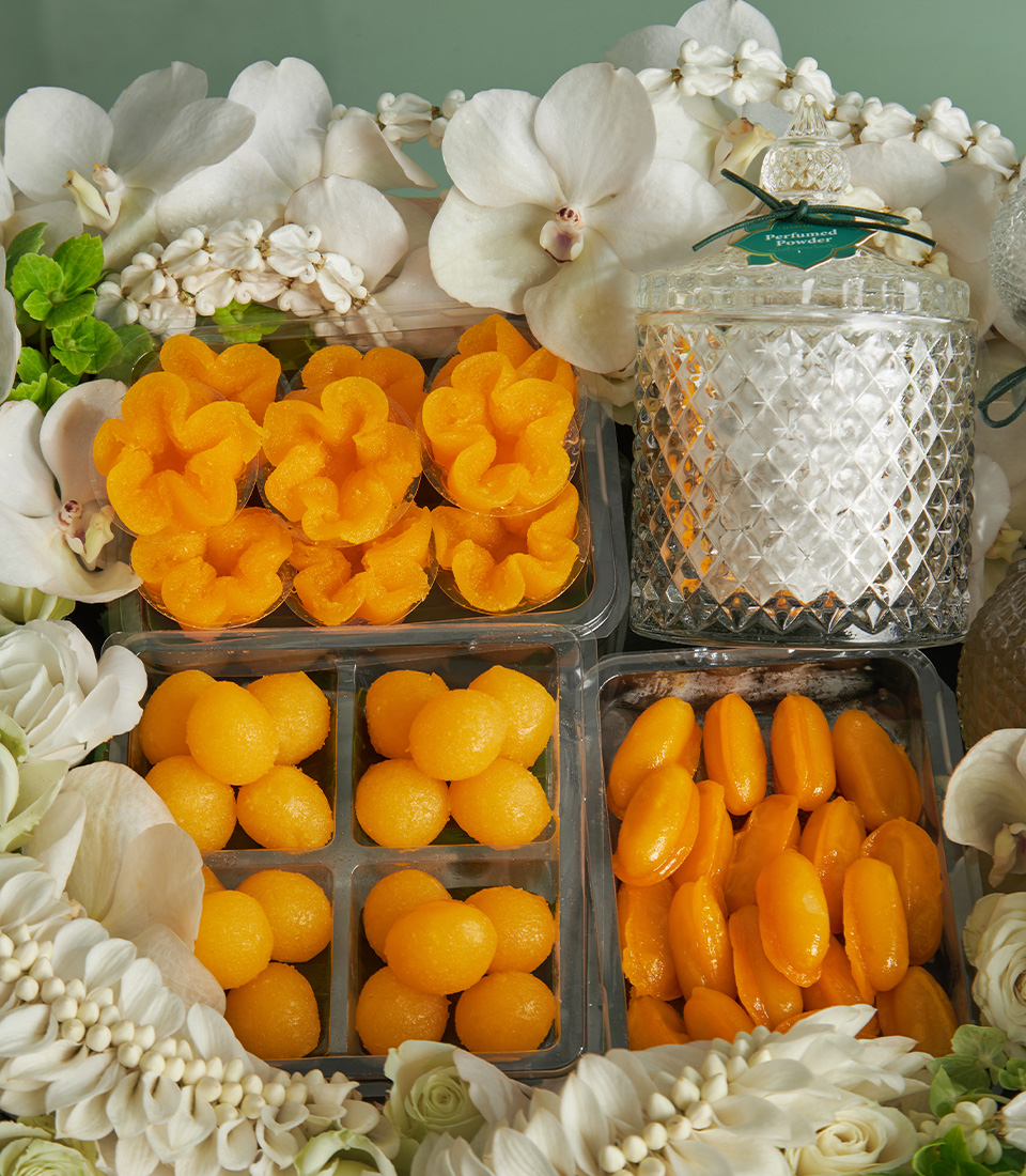 Thai Auspicious Dessert Gift Set Celebrate Songkran with a graceful wooden box filled with Thai golden desserts, scented water, perfumed powder, and gold-scented balm — a perfect offering for elders.