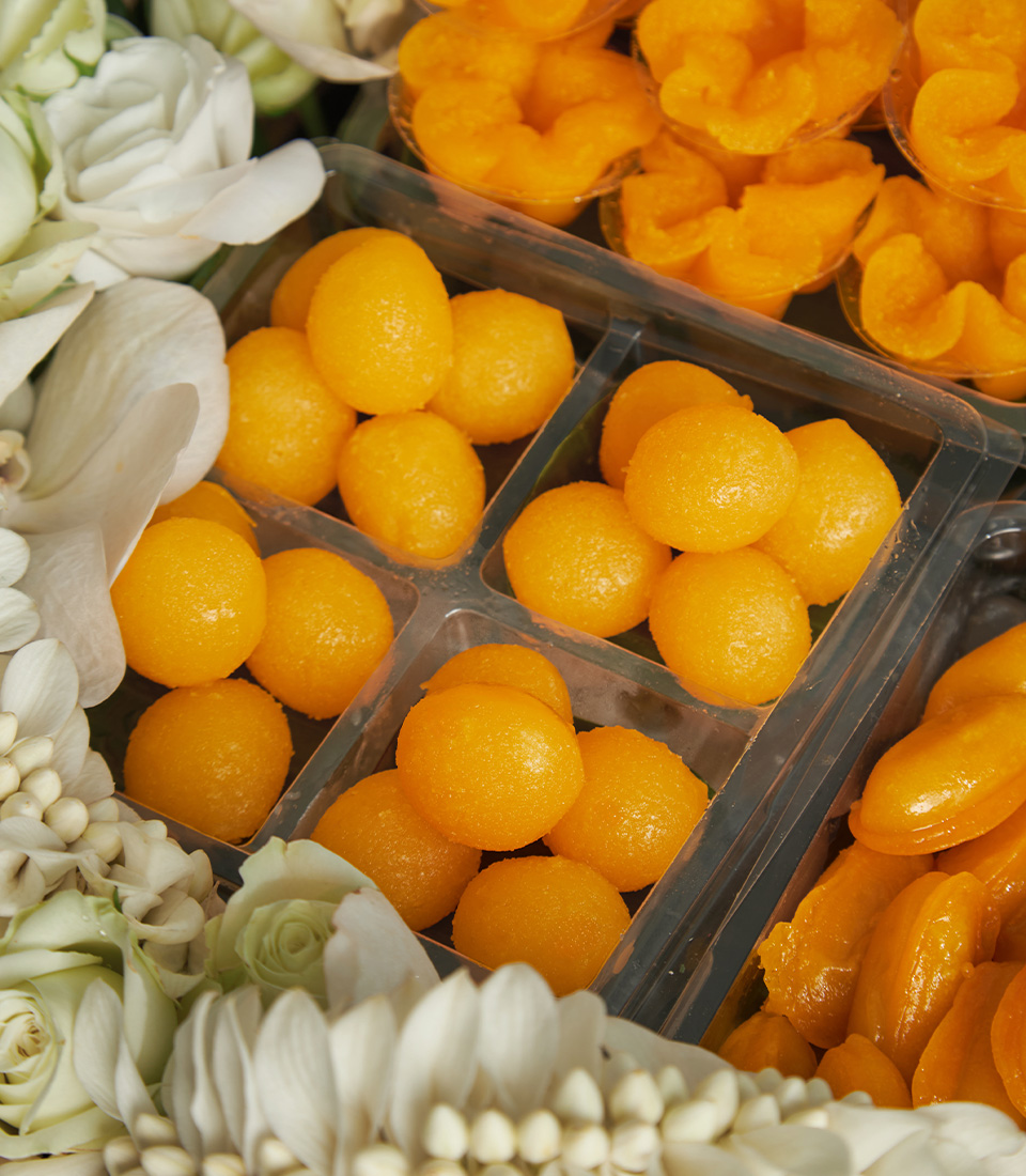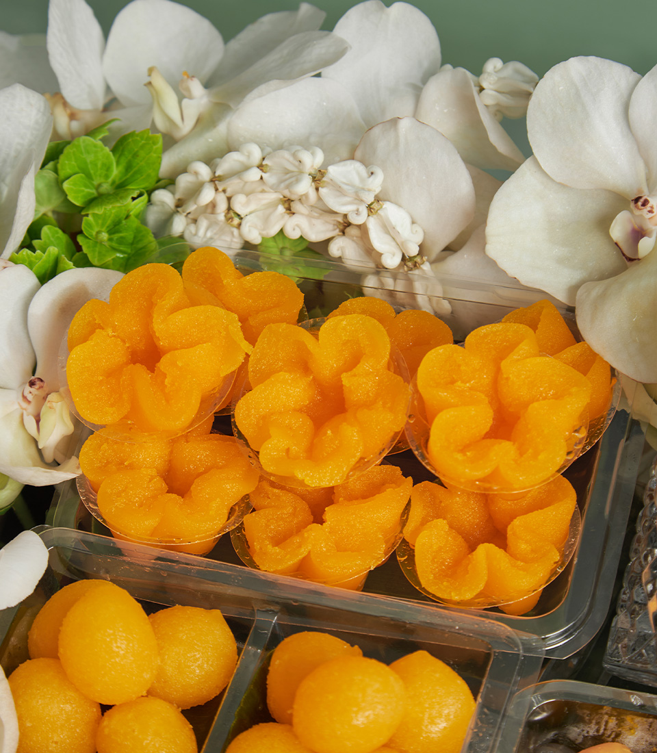 Thai golden desserts with floral decor and scented water in a wooden box — a graceful and respectful Songkran gift for beloved elders.