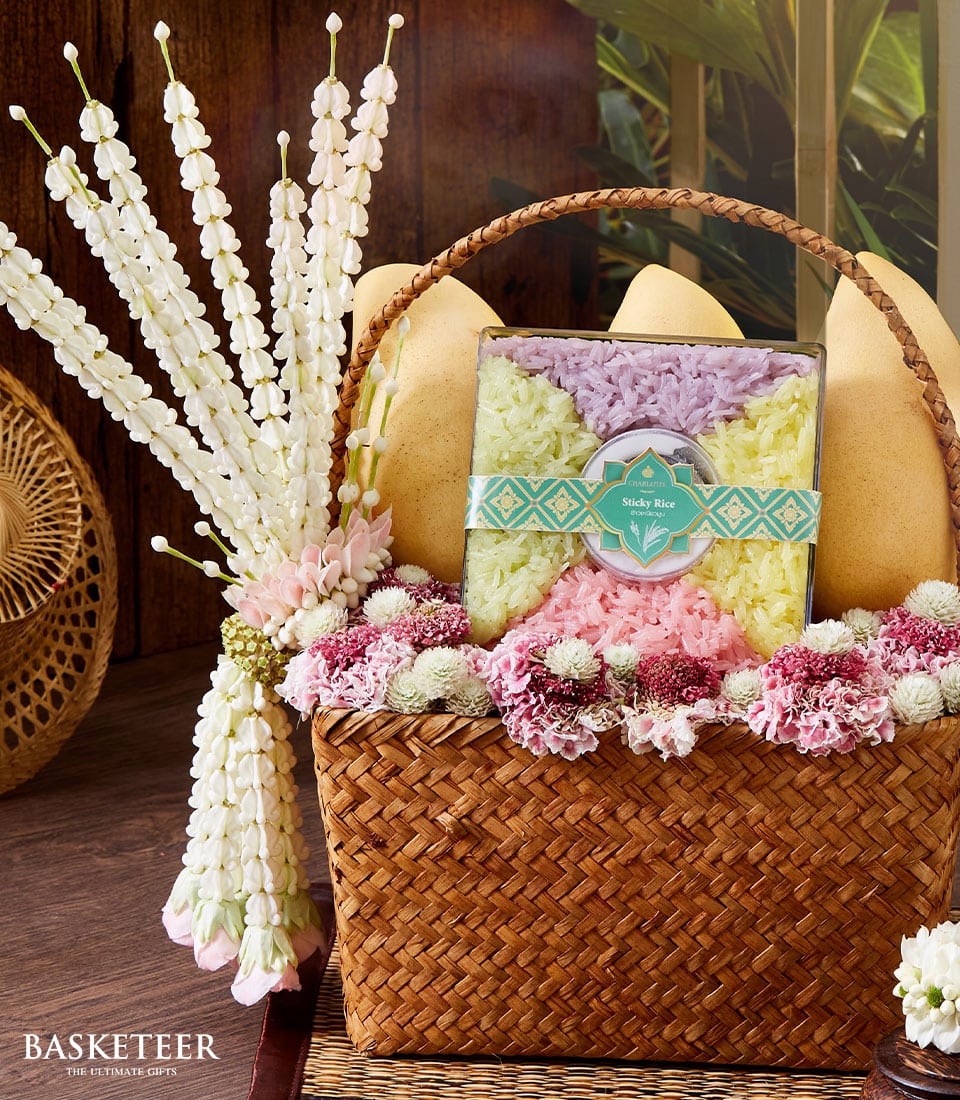Premium Mango & Sticky Rice Gift Basket This luxurious gift basket features Thailand’s iconic mango and sticky rice, presented in a handwoven basket with delicate jasmine garlands and floral decor. A perfect gift for festivals, celebrations, and cultural ceremonies, combining authentic Thai flavors with an elegant presentation. Ideal for corporate gifts, religious offerings, or premium gifting.