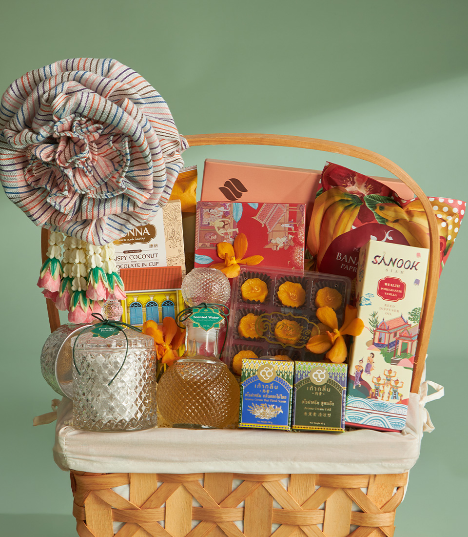 Thai Heritage Bliss Songkran Gift Basket Celebrate Thai culture with this luxurious Songkran gift basket, featuring Nang Loy scented water, Thai desserts, aromatic creams, and premium snacks—all artfully arranged in a dual-handle woven wooden basket.
