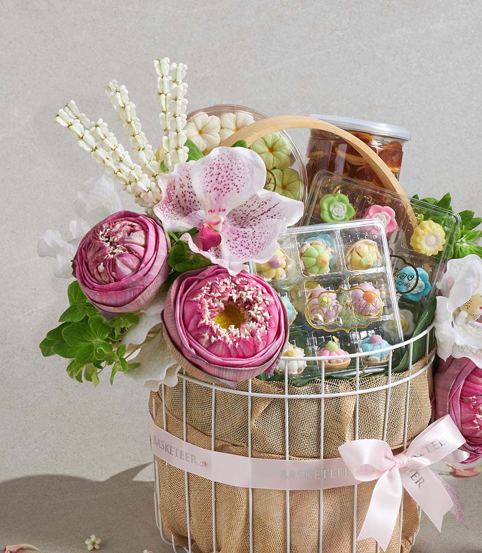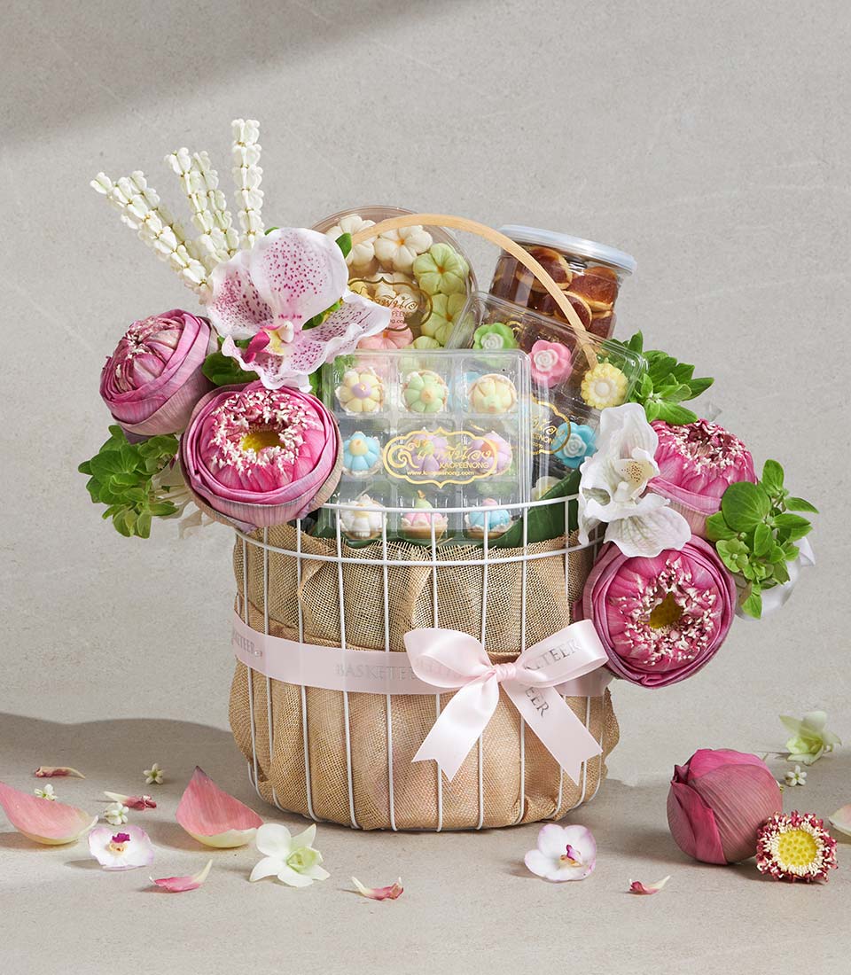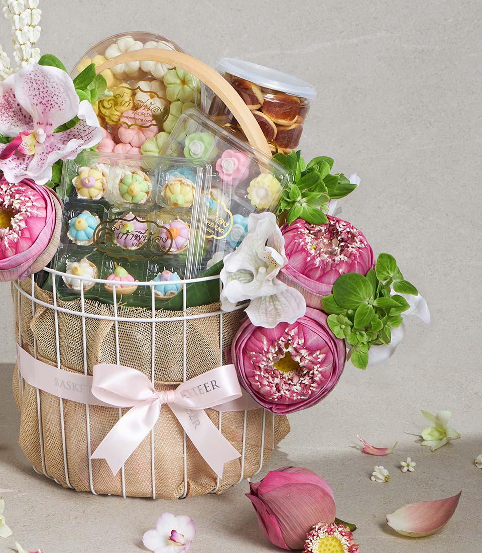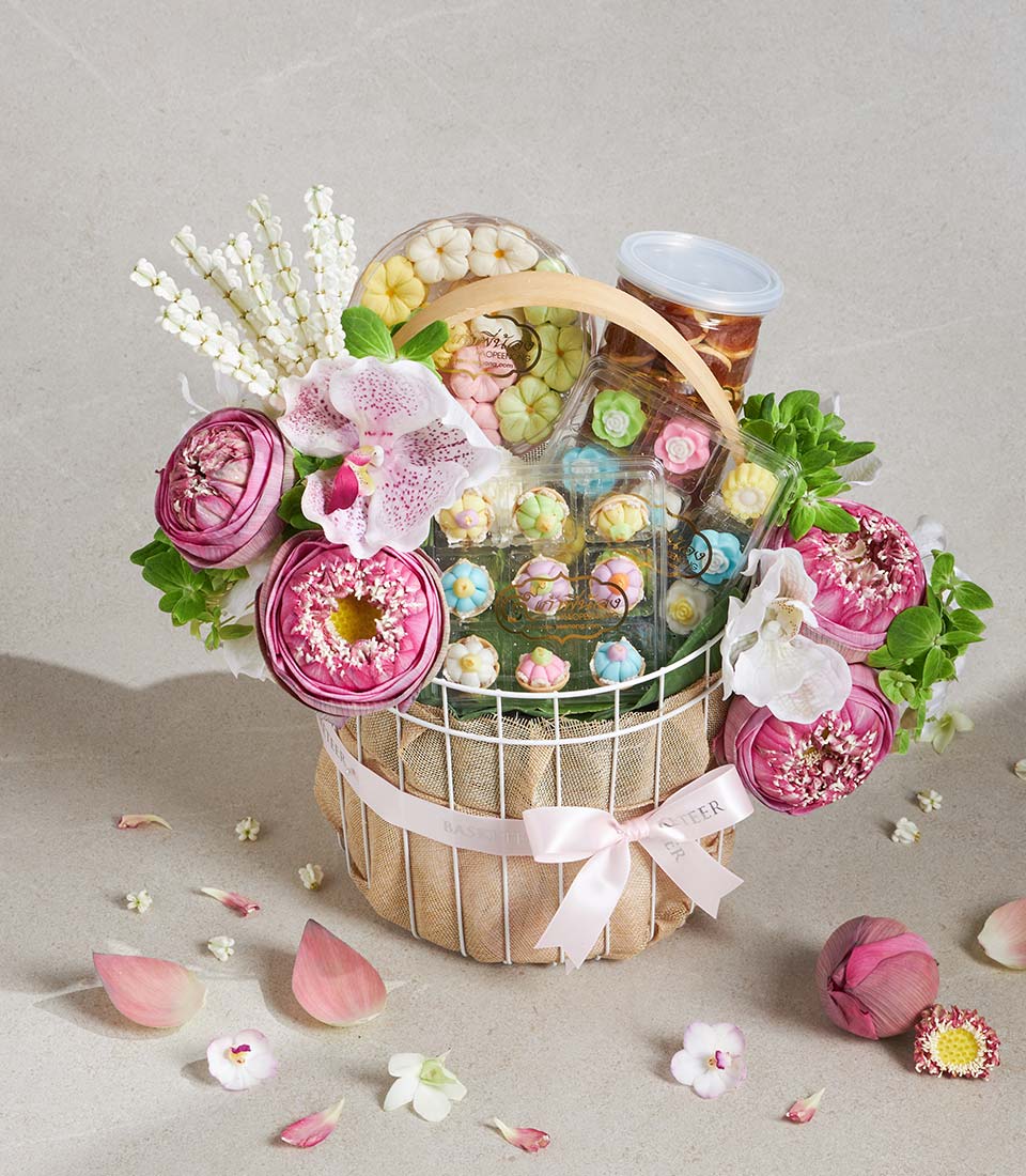 Premium Thai Dessert Gift Basket Traditional Sweet Collection A refined Thai dessert gift basket featuring a selection of traditional Thai sweets and delicate butter cookies, thoughtfully curated for their rich flavour and artisanal charm. Elegantly arranged in a soft-toned basket with fresh pink lotus-themed floral decoration, this set reflects sweetness, grace, and cultural heritageperfect for meaningful and elegant gifting.