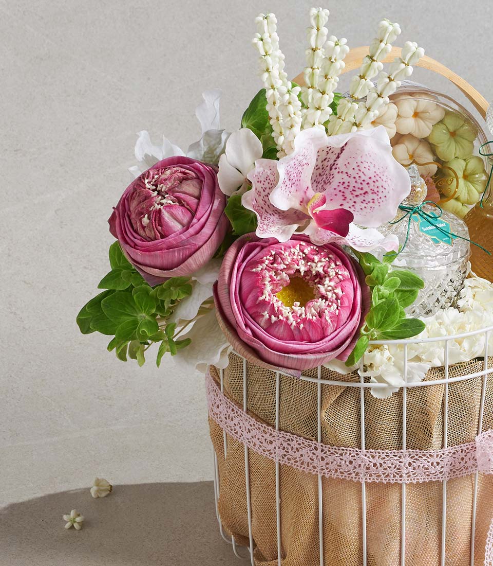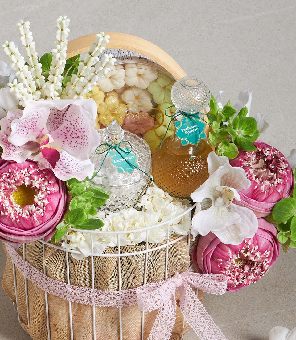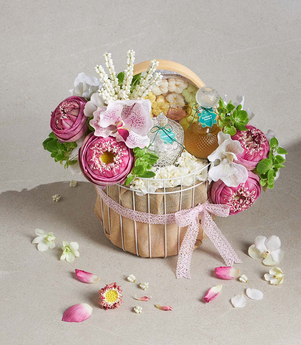 A graceful Songkran gift basket inspired by Thai lotus elegance, featuring scented water, traditional powder, and delicately arranged floral elements - thoughtfully curated to express respect, blessings, and heartfelt wishes. A meaningful gift for elders and loved ones during the Thai New Year celebration.