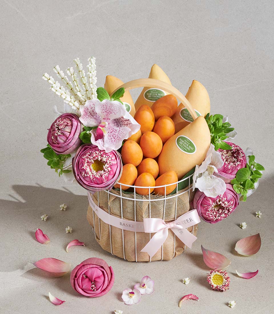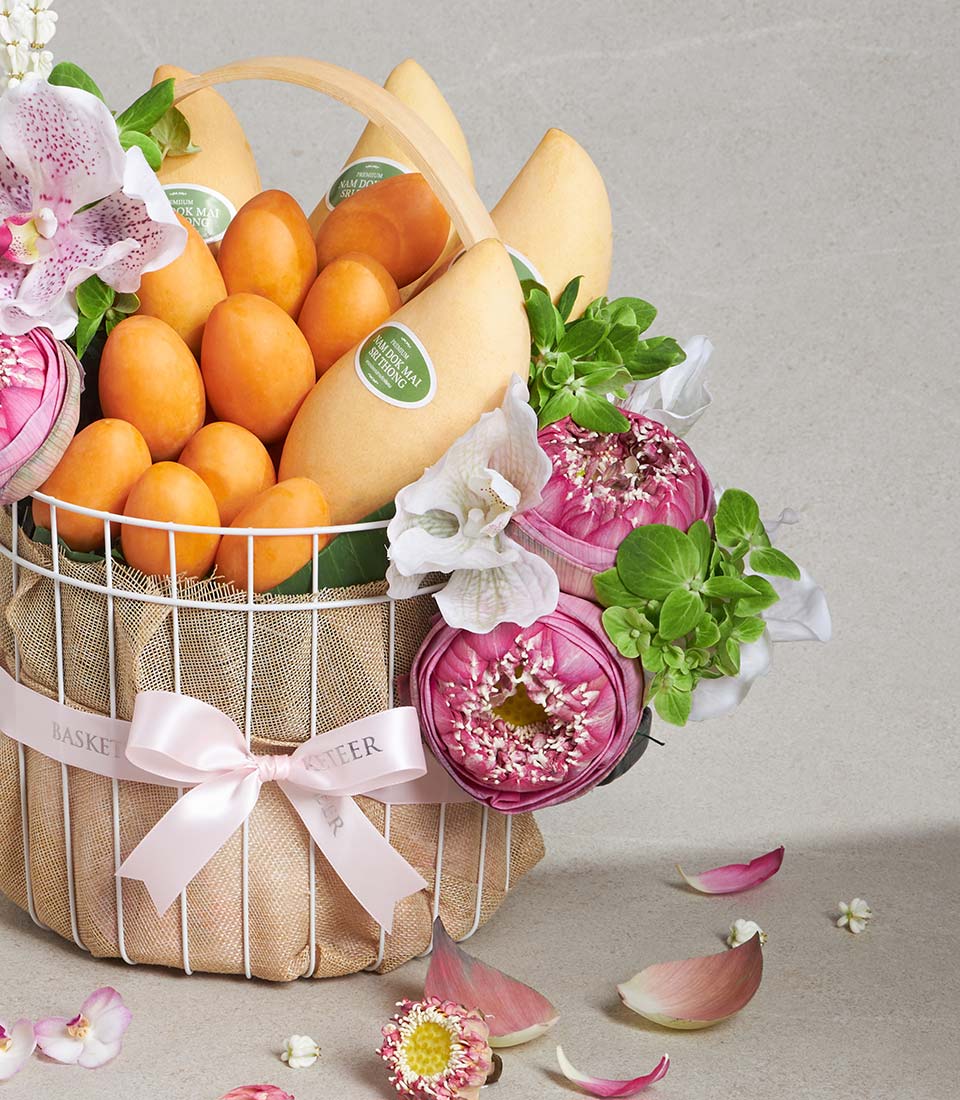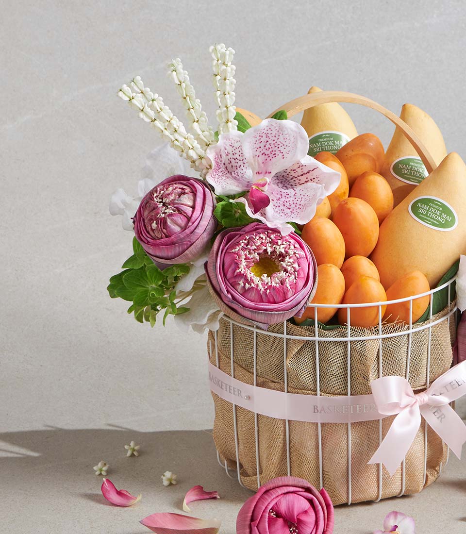 Premium Thai Summer Fruit Basket Mango & Mayongchid Floral Elegance A refined Thai summer fruit basket featuring premium Nam Dok Mai mangoes and sweet mayongchids, carefully selected for their freshness and natural flavour. Elegantly arranged in a soft-toned basket with fresh pink lotus-themed floral decoration, this graceful set blends vibrant fruit with delicate floral beautyperfect for sophisticated and heartfelt gifting.