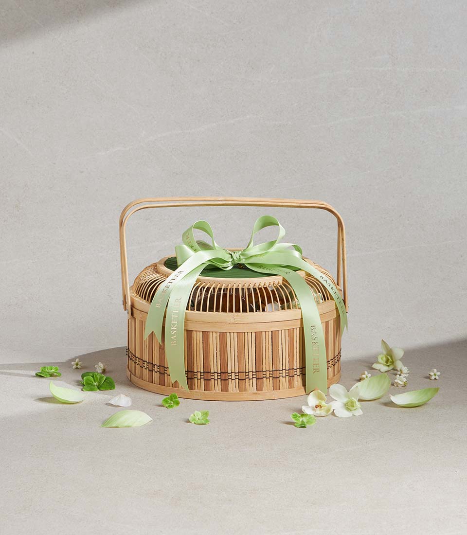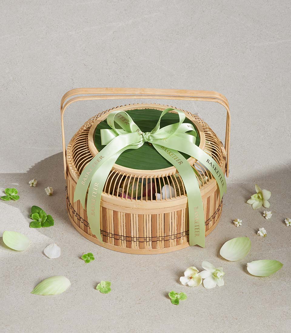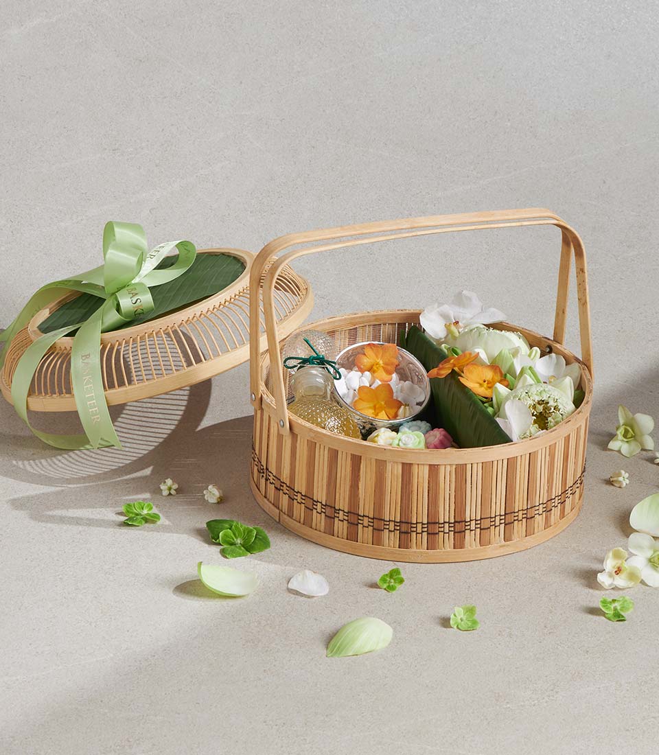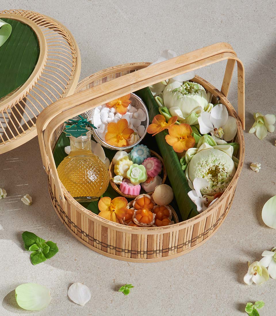 Premium Songkran Gift Basket Thai Blessing Ceremony Set A refined Thai Songkran gift basket featuring traditional scented water, an elegant Thai-pattern aluminium water bowl, and a selection of classic Thai desserts. Beautifully arranged in a natural woven basket with fresh white floral decoration, this set reflects respect, purity, and cultural heritageperfect for meaningful gifting during the Thai New Year and traditional ceremonies.