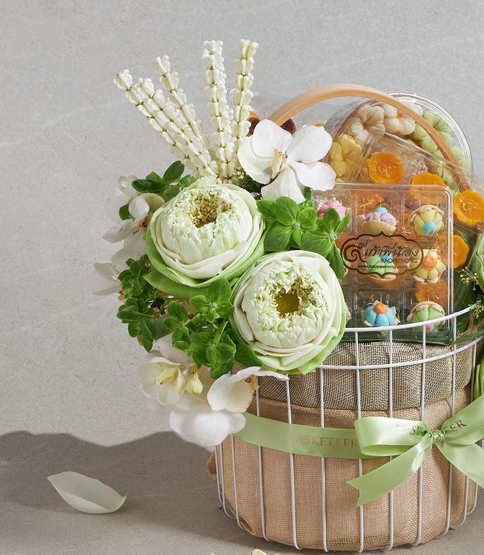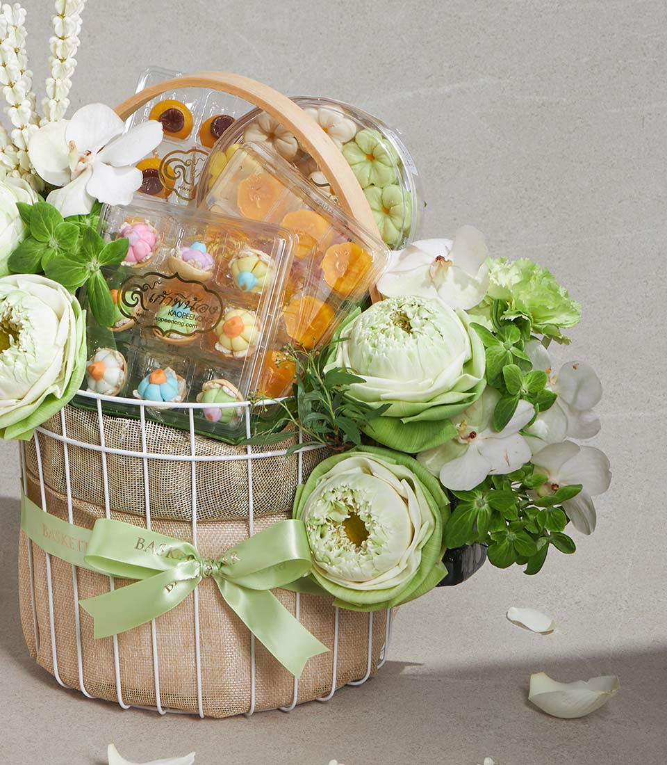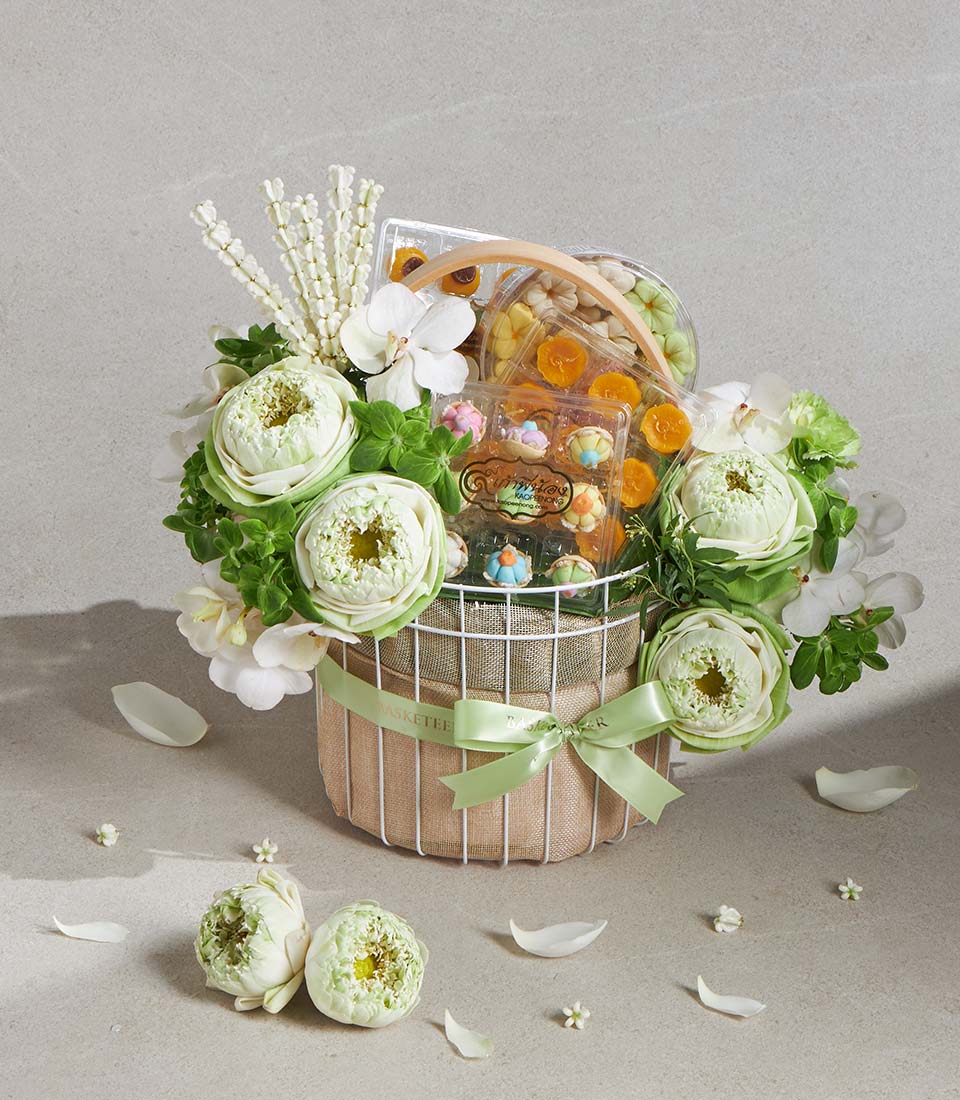 Premium Songkran Gift Basket Lotus Blossom Serenity Thai Dessert Set A serene and graceful Songkran gift basket inspired by the purity and elegance of white lotus flowers. This refined set features a selection of traditional Thai desserts, thoughtfully curated to convey blessings, harmony, and cultural beauty. Presented in a classic woven basket and adorned with fresh white lotus-inspired floral decoration, this set offers a meaningful expression of respect and peaceful wishes for the Thai New Year.