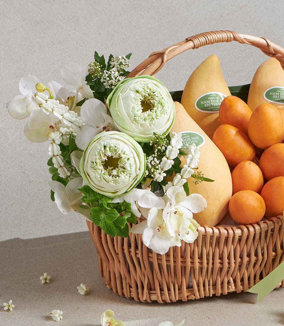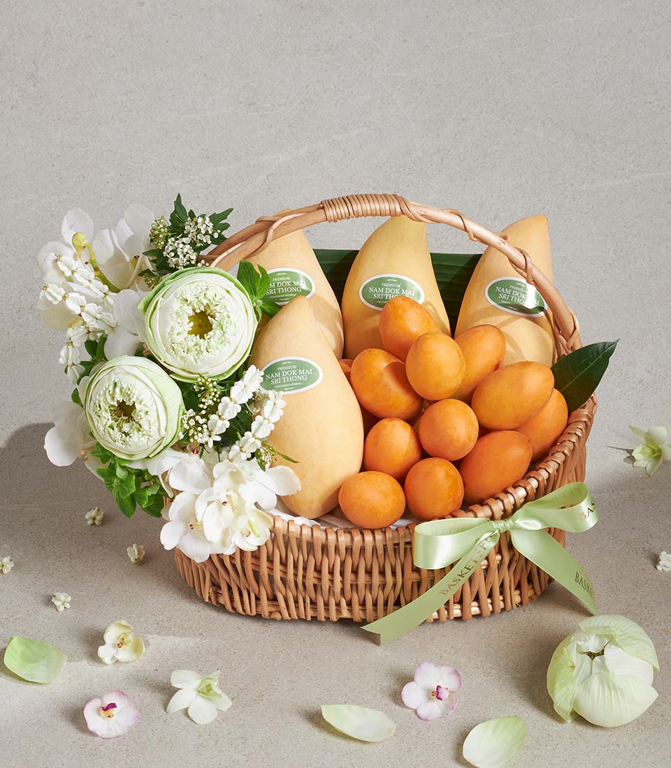 A beautifully arranged Songkran fruit basket featuring premium mangoes and fresh mayongchid, complemented by delicate white floral accents in a natural wicker basket. Simple yet refined, this elegant gift expresses warmth, respect, and thoughtful wishes for Thai New Year celebrations with elders and loved ones.