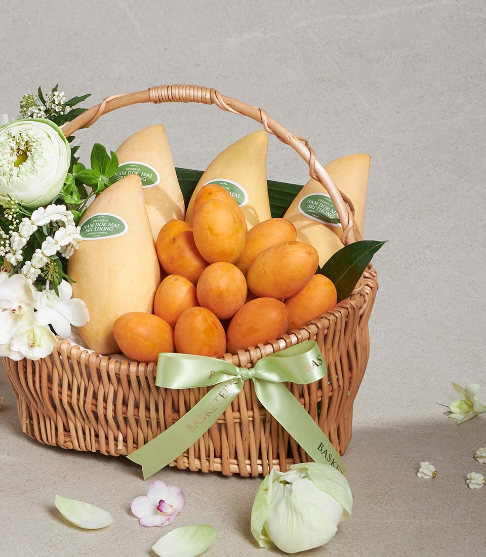 Premium Thai Summer Fruit Basket Mango & Mayongchid Selection A beautifully curated Thai summer fruit basket featuring premium Nam Dok Mai mangoes and sweet mayongchids, carefully selected for their freshness and natural flavour. Elegantly presented in a classic wicker basket with fresh white lotus-themed floral decoration, this refined arrangement captures the essence of Thai summerperfect for thoughtful and refreshing gifting.