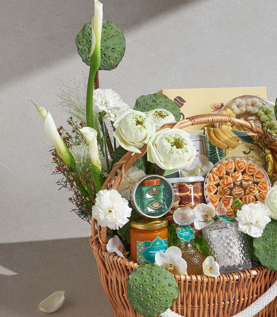 Premium Songkran Gift Basket Lotus Heritage Grand Set A distinguished Thai Songkran gift basket crafted for refined and meaningful gifting. This grand set features a harmonious blend of traditional Thai scented elements, premium snacks, fine coffee, and heritage desserts, elegantly arranged in a classic wicker basket with fresh white lotus-inspired floral decoration. A graceful expression of respect, purity, and prosperity for Thai New Year celebrations.