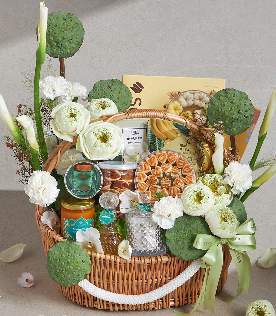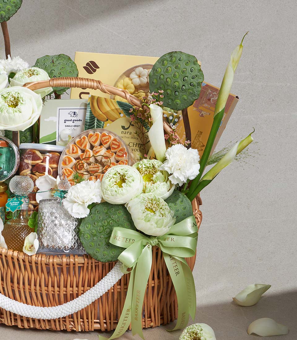 A refined Songkran gift basket combining Thai traditional sweets, premium snacks, aromatic scented items, and specialty coffee, elegantly arranged with fresh white lotus floral accents. Thoughtfully curated for both enjoyment and cultural meaning, this versatile set is perfect for expressing appreciation, respect, and warm wishes during Thai New Year.