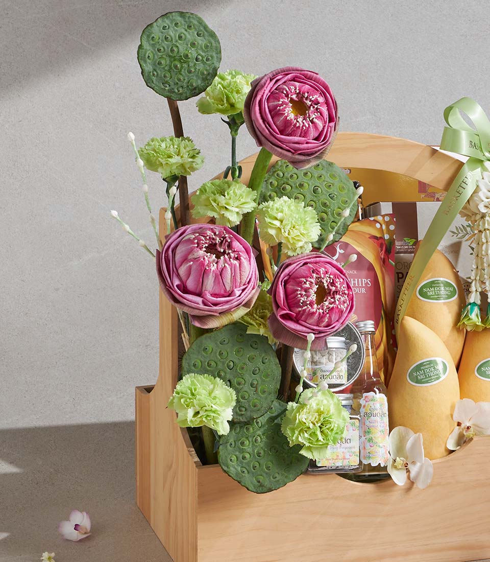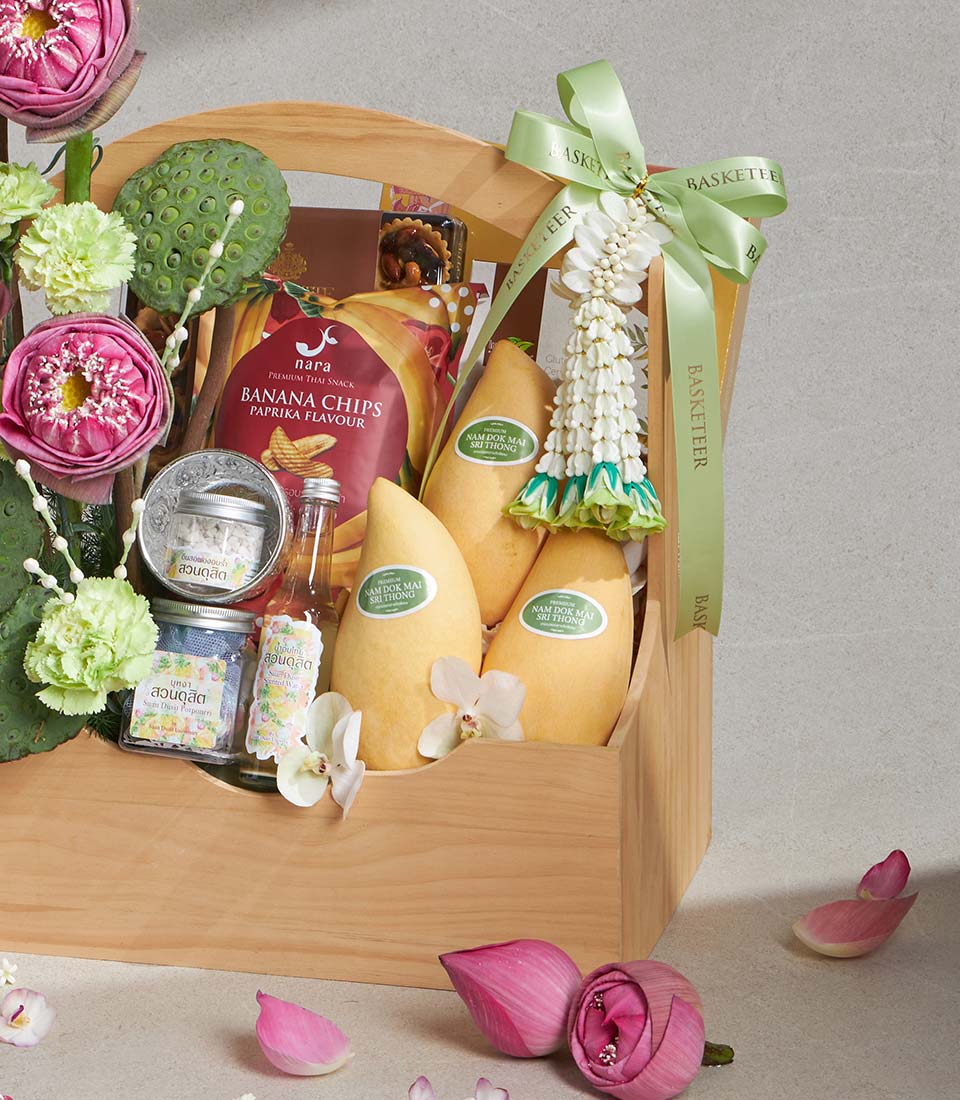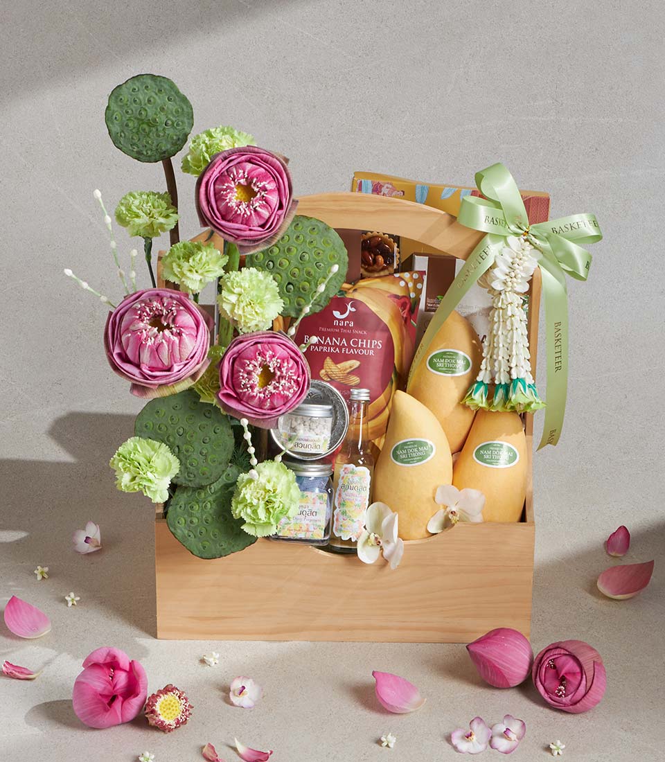 Premium Songkran Gift Basket Songkran Delight Mango & Lotus Set A beautifully curated Songkran gift basket that captures the essence of Thai New Year through elegance, tradition, and refined taste. This premium set features golden Nam Dok Mai mangoes paired with traditional Thai desserts, aromatic scented elements, and curated snacks, thoughtfully arranged in a natural wooden basket and adorned with fresh pink lotus-inspired floral decoration. A meaningful gift to express respect, gratitude, and prosperity during the Songkran celebration.