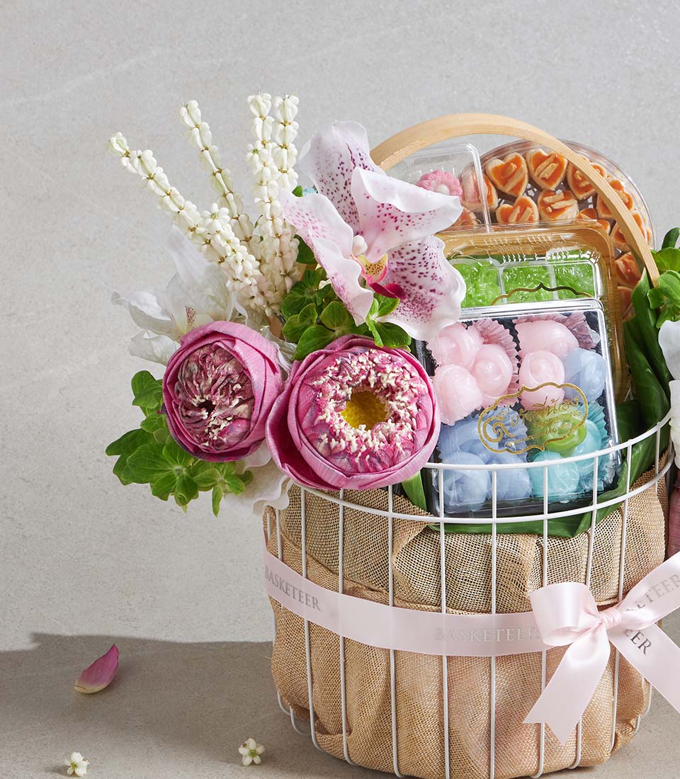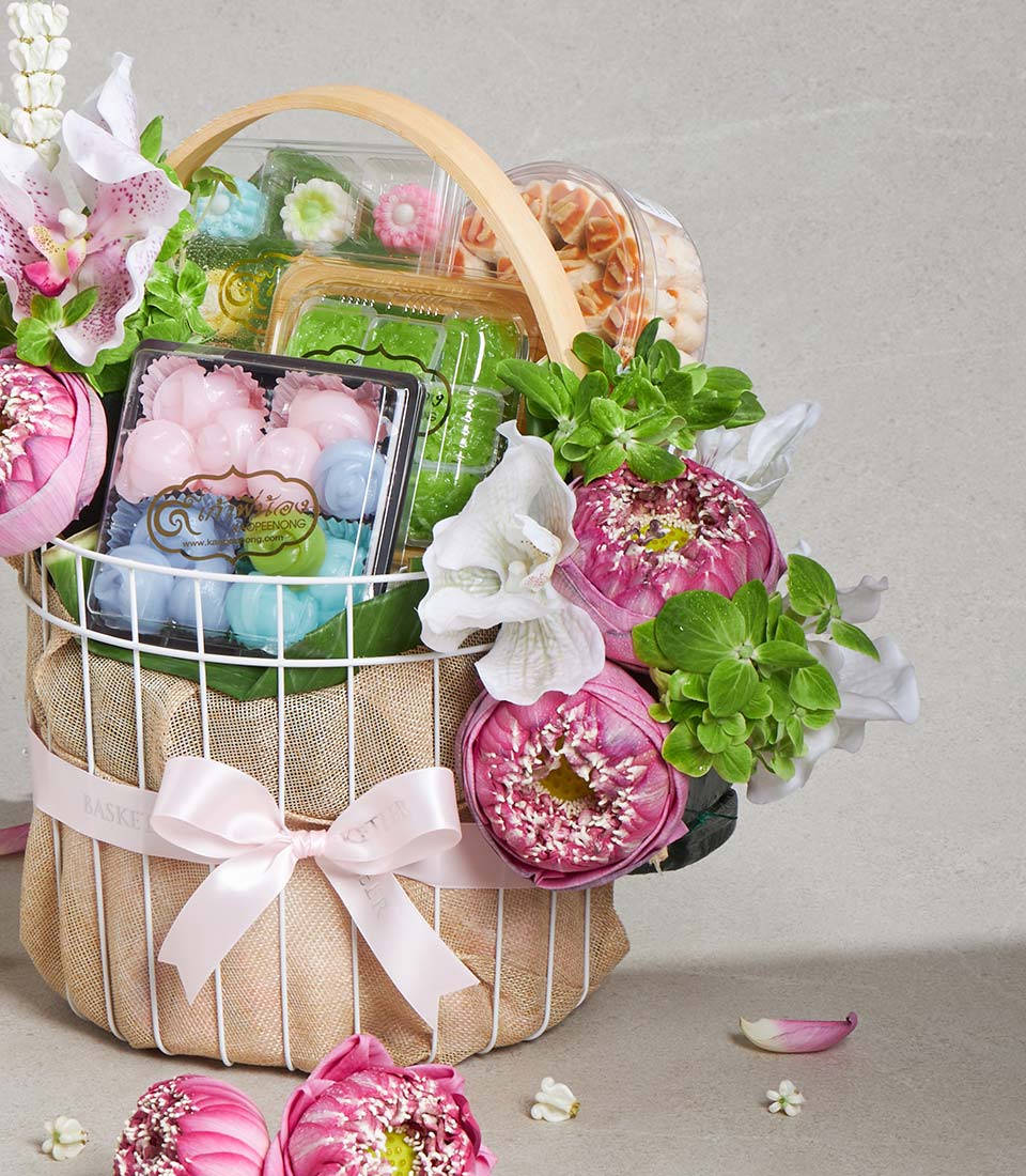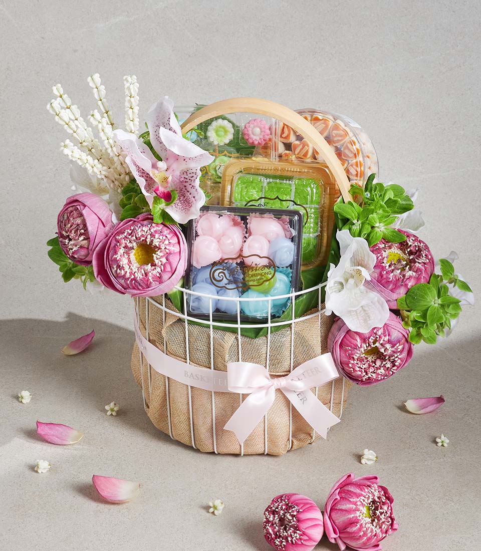 Premium Songkran Gift Basket Lotus Blessing Thai Dessert Set A charming and meaningful Songkran gift basket inspired by the beauty of pink lotus flowers and the spirit of Thai New Year blessings. This delightful set features a selection of traditional Thai desserts and sweet treats, thoughtfully curated to convey joy, prosperity, and heartfelt wishes. Elegantly arranged in a classic woven basket and adorned with fresh pink lotus-inspired floral decoration, this set is a graceful expression of care and celebration.