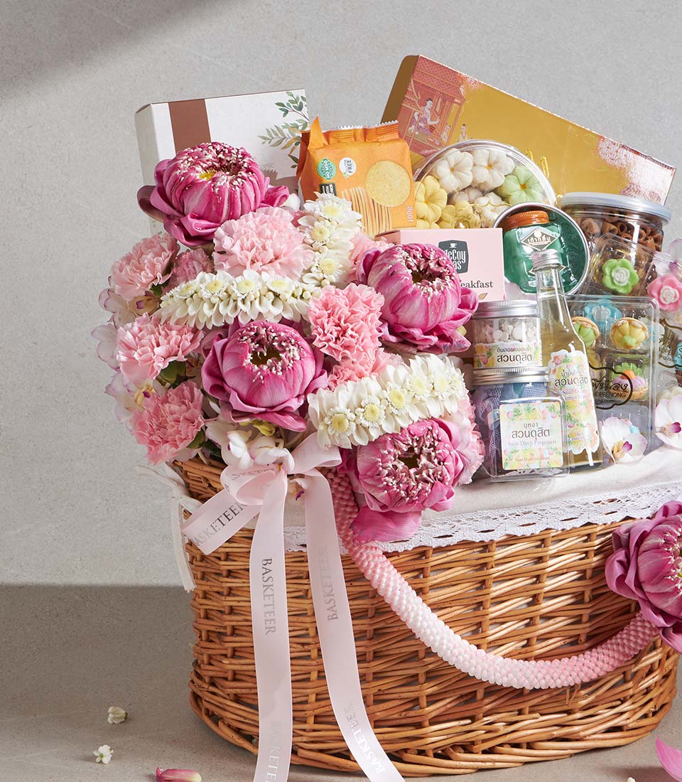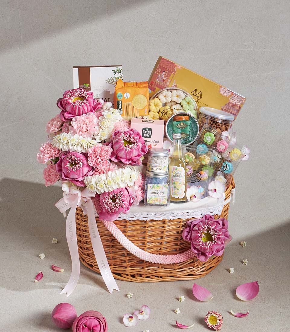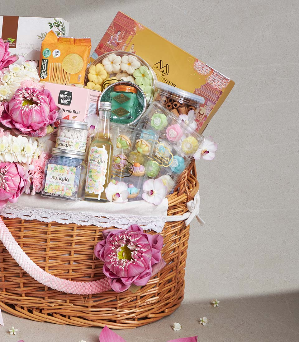 Premium Songkran Gift Basket Lotus Heritage Deluxe Set An exquisite Thai Songkran gift basket designed to reflect heritage, elegance, and refined gifting. This luxurious set combines traditional Thai desserts, aromatic scented elements, premium tea, and curated snacks, beautifully arranged in a classic wicker basket adorned with fresh pink lotus-inspired floral decoration. A meaningful expression of respect, gratitude, and prosperity for Thai New Year celebrations.