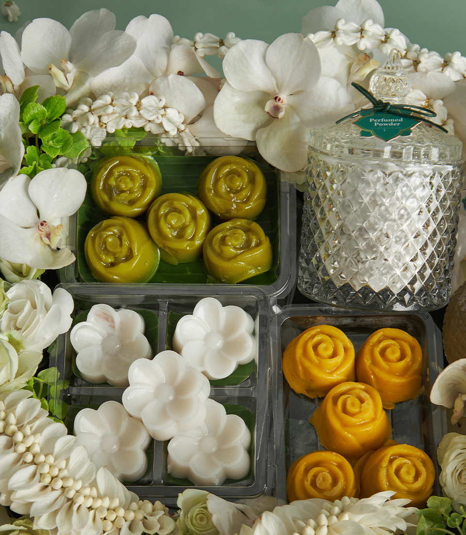 Thai Sweets & Good Fortune Songkran Set Celebrate Songkran with an elegant Thai gift set featuring classic desserts, scented water, herbal aroma cream, and handcrafted floral decor — perfect for honouring elders with grace.