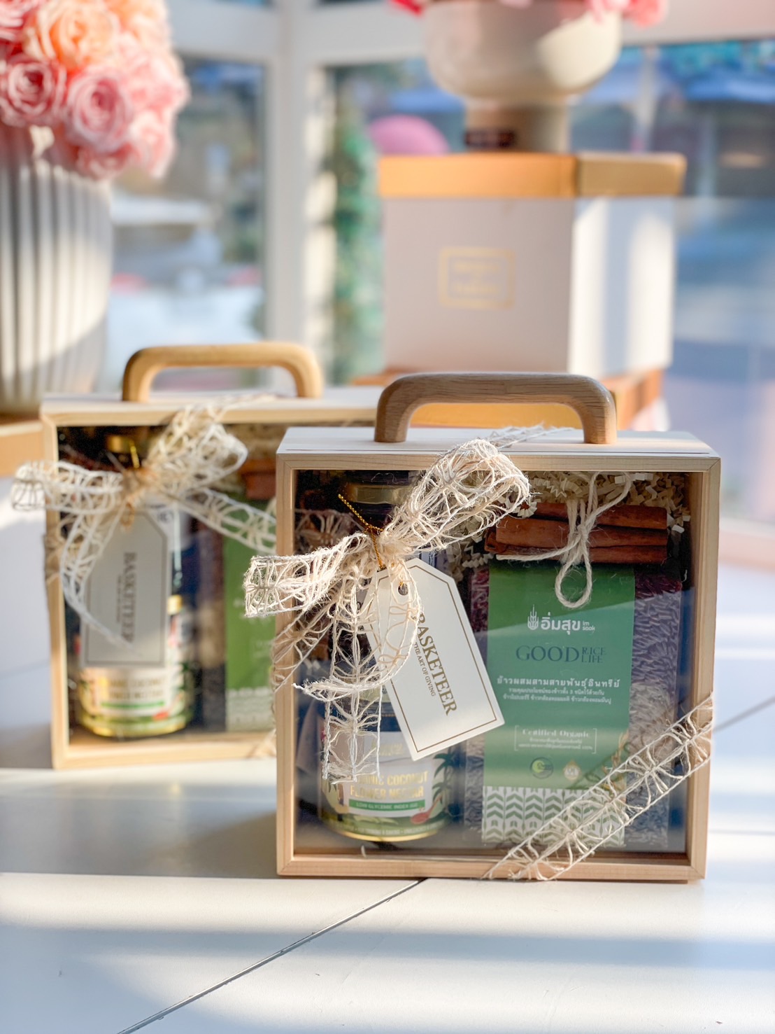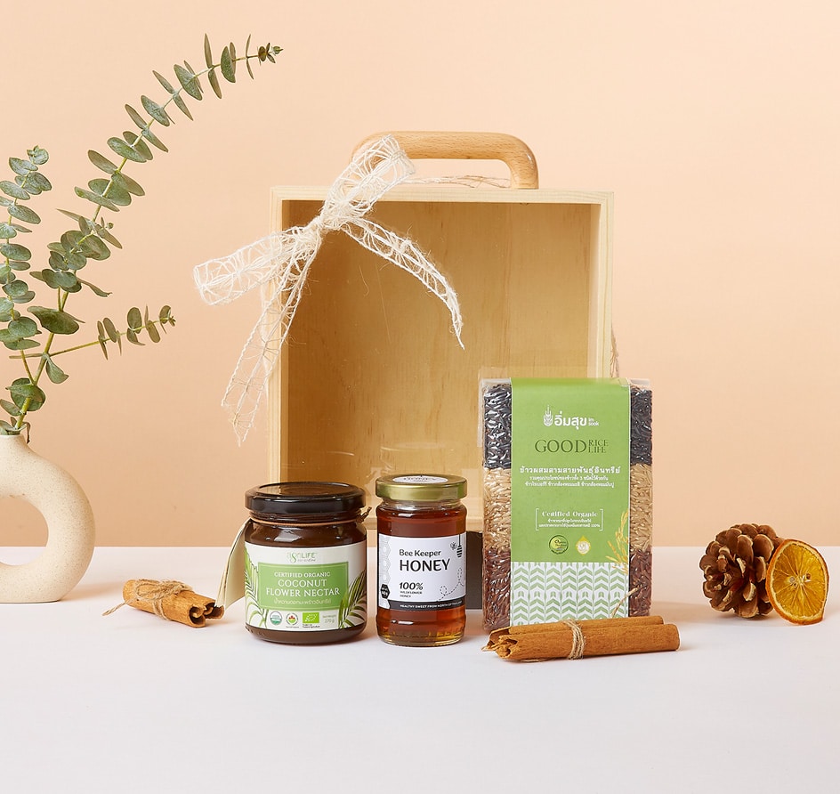Organic wellness gift set with Thai rice, herbal tea, and coconut sugar in a handcrafted wooden box. Perfect for health lovers.