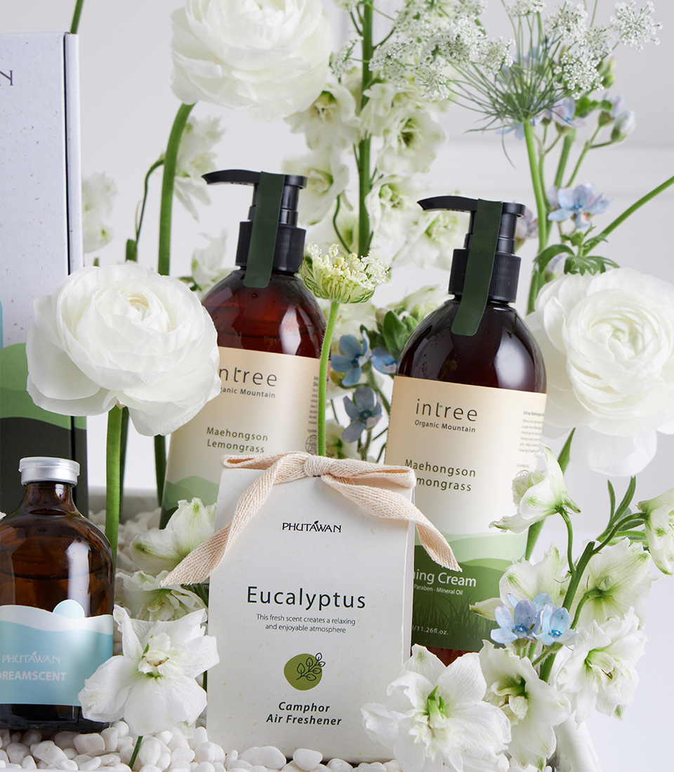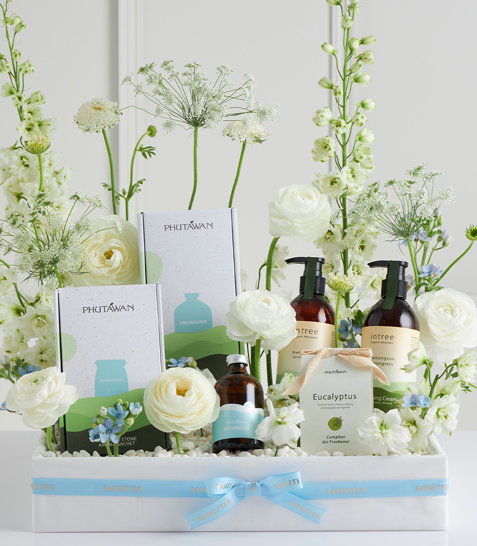 White Bloom Wellness Gift Basket This luxury wellness gift basket features a fresh arrangement of elegant white blooms paired with premium spa and wellness products including shower gel, body lotion, essential oil, and aroma diffusers. Perfect for gifting relaxation, beauty, and care.