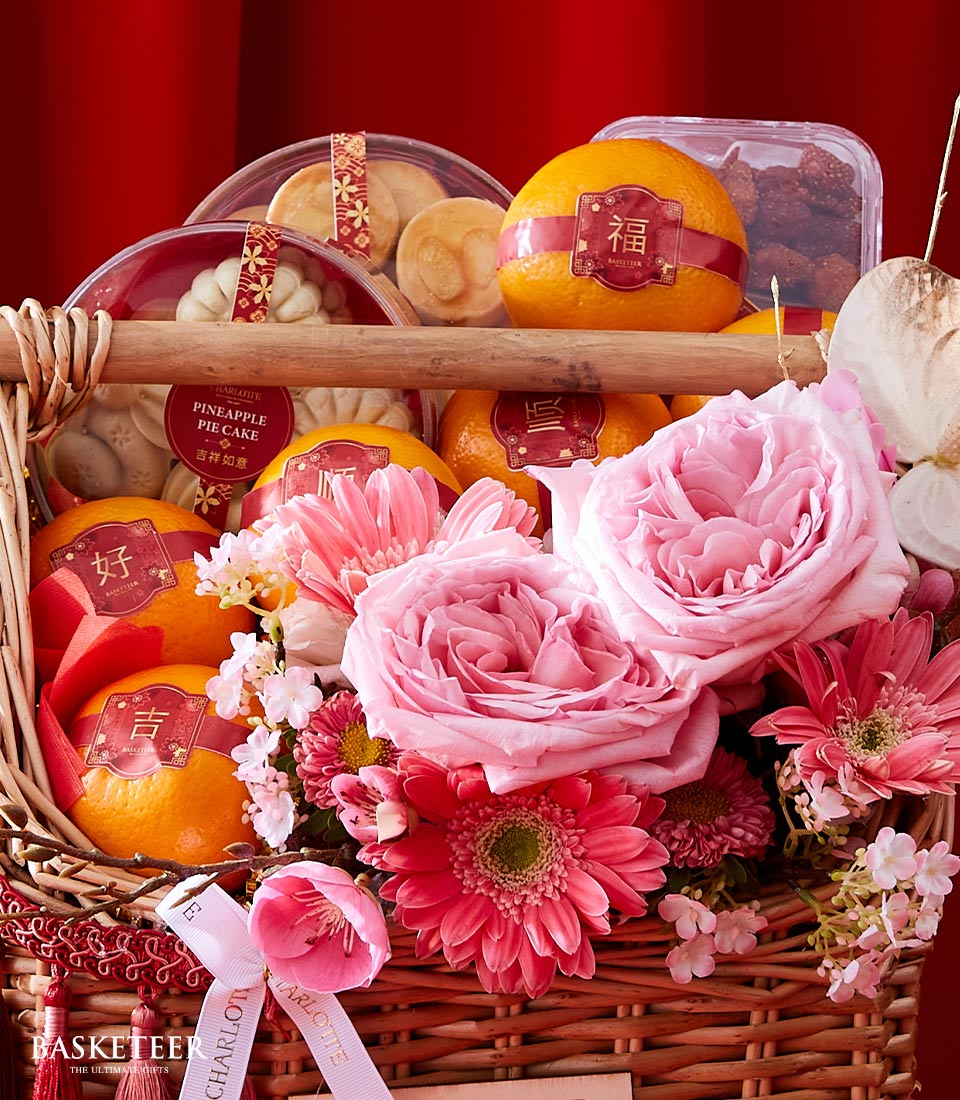 Luxury Lunar New Year Celebration Basket This beautifully curated gift basket features fresh oranges, pineapple pie cakes, and gourmet cookies, complemented by vibrant pink floral arrangements. Perfectly designed for Lunar New Year celebrations, this basket symbolizes prosperity and happiness for your loved ones.