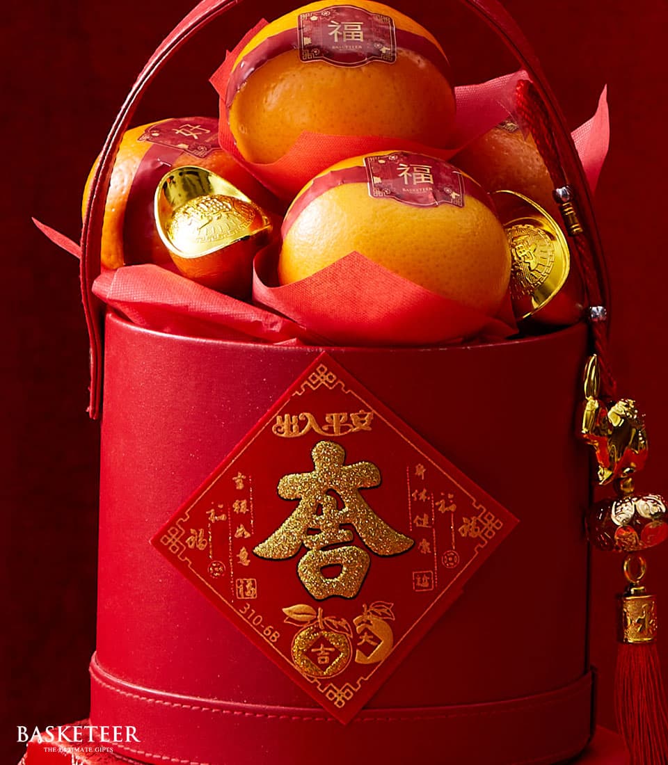 Elegant Prosperity Mandarin Gift Box A vibrant red gift box filled with premium mandarins, symbolizing wealth and good fortune. Accented with gold details and a traditional tassel, it’s the perfect gift for Chinese New Year celebrations. Share blessings and prosperity with loved ones.