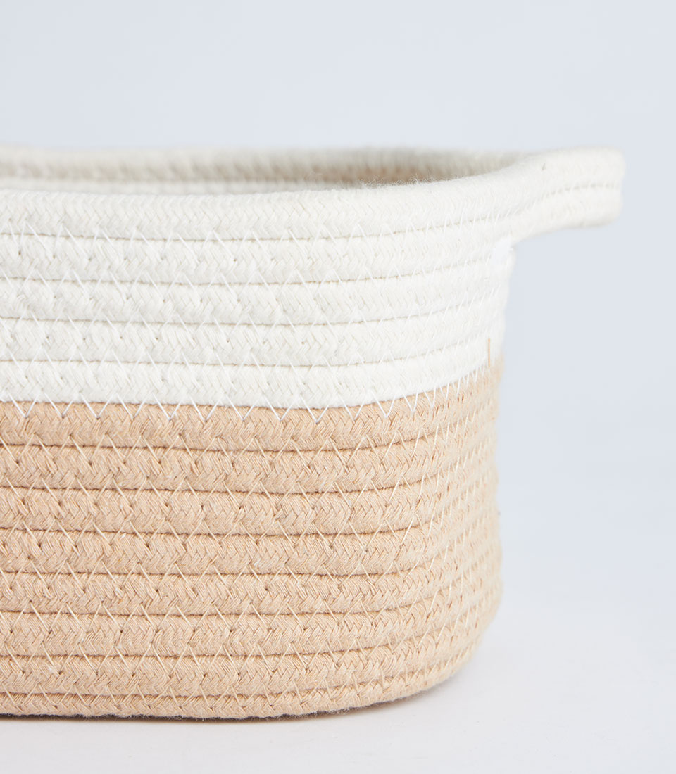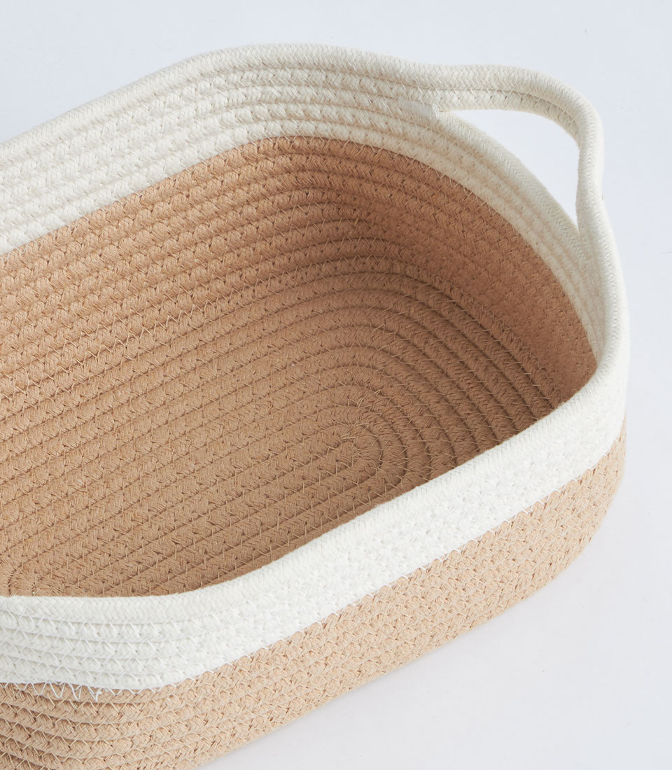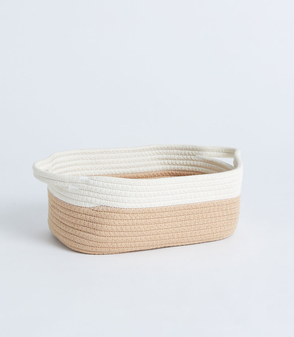 A beige and white cotton rope storage basket with a fitted lid, designed for gift sets, bakery hampers, and decorative storage presentations.