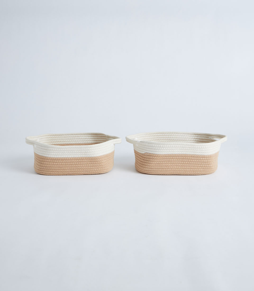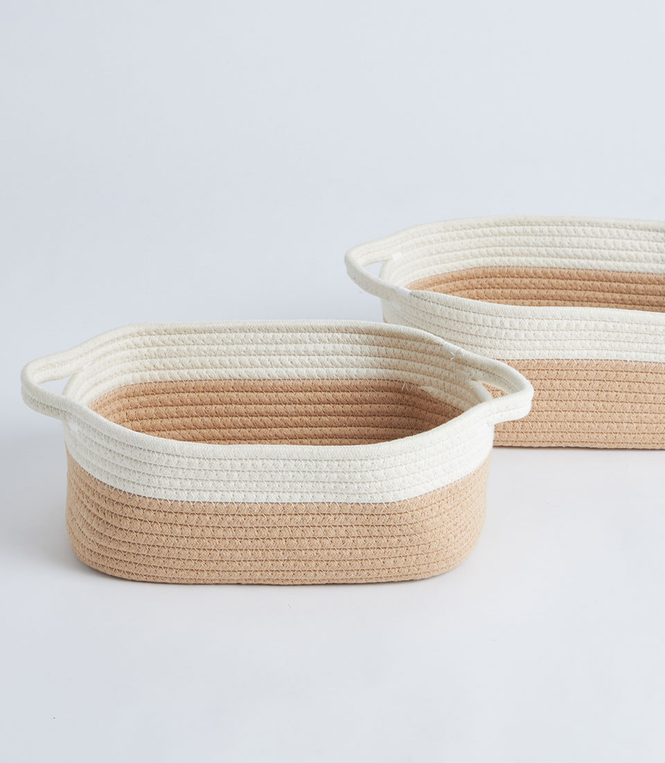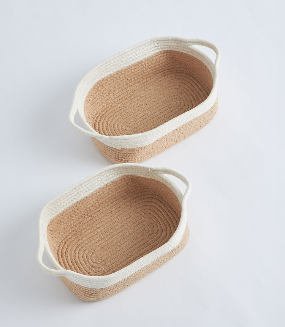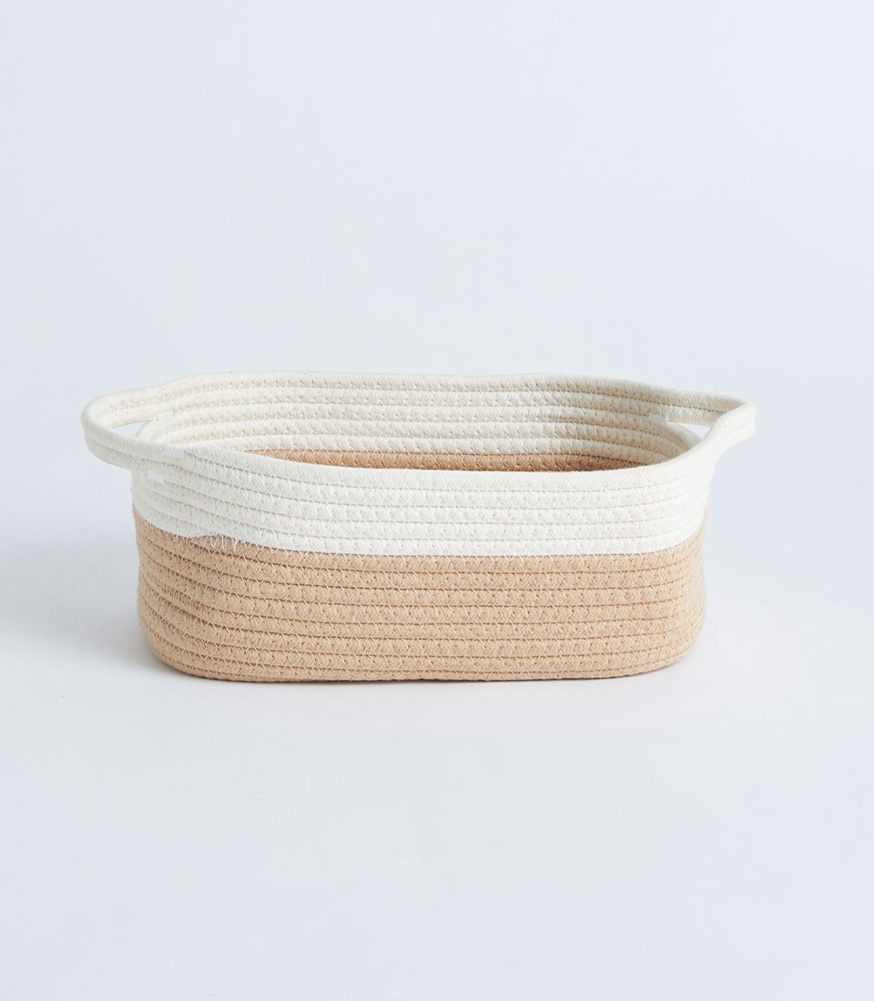 A beige and white cotton rope storage basket with a fitted lid, designed for gift sets, bakery hampers, and decorative storage presentations.