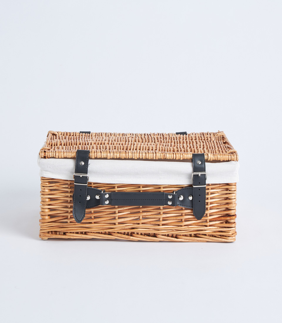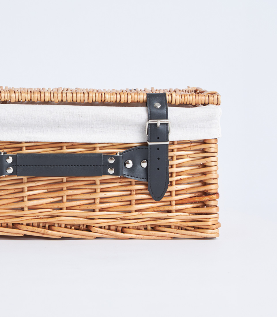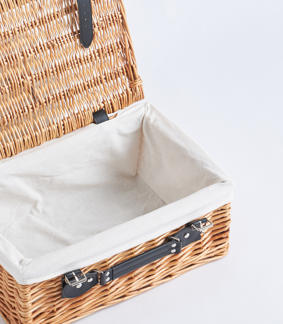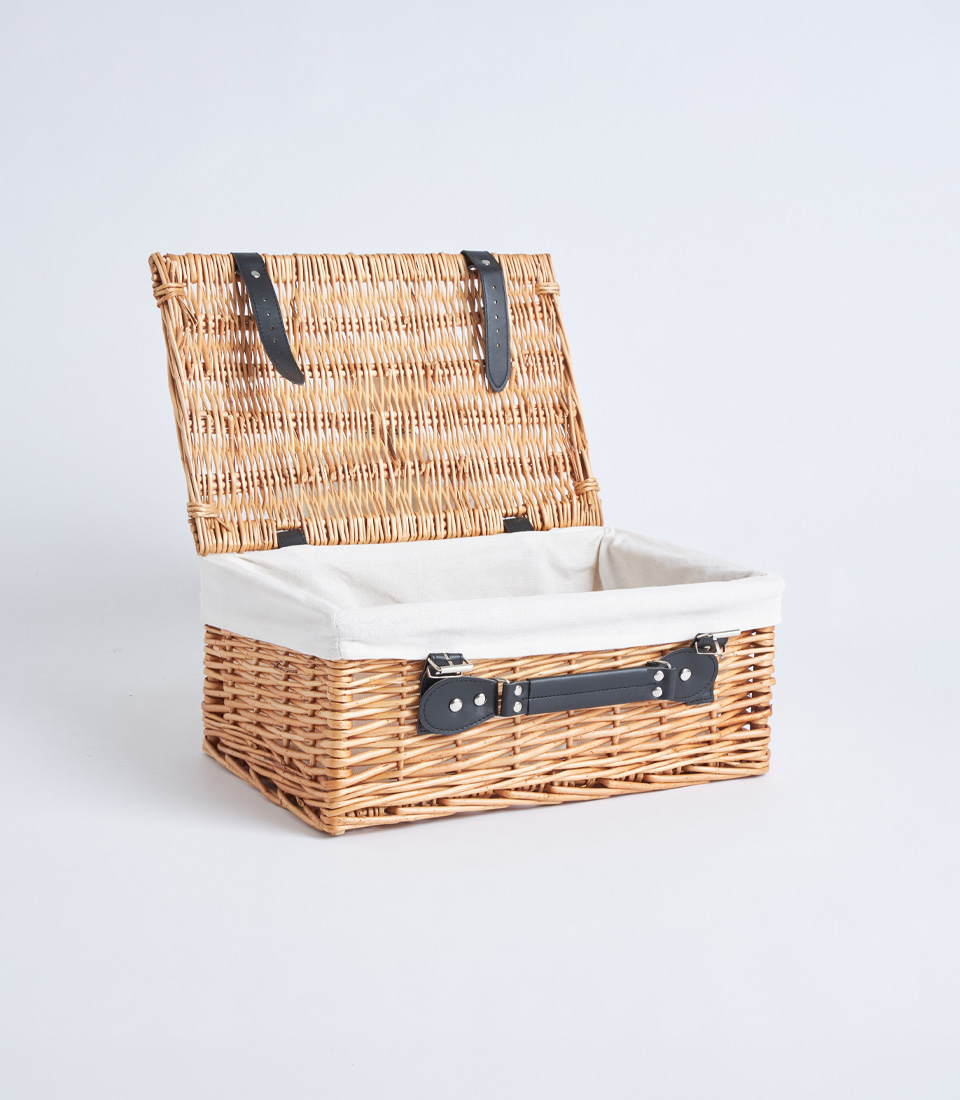 A classic wicker picnic hamper case with lid, leather straps, and fabric lining, designed for elegant gift hampers and picnic baskets.