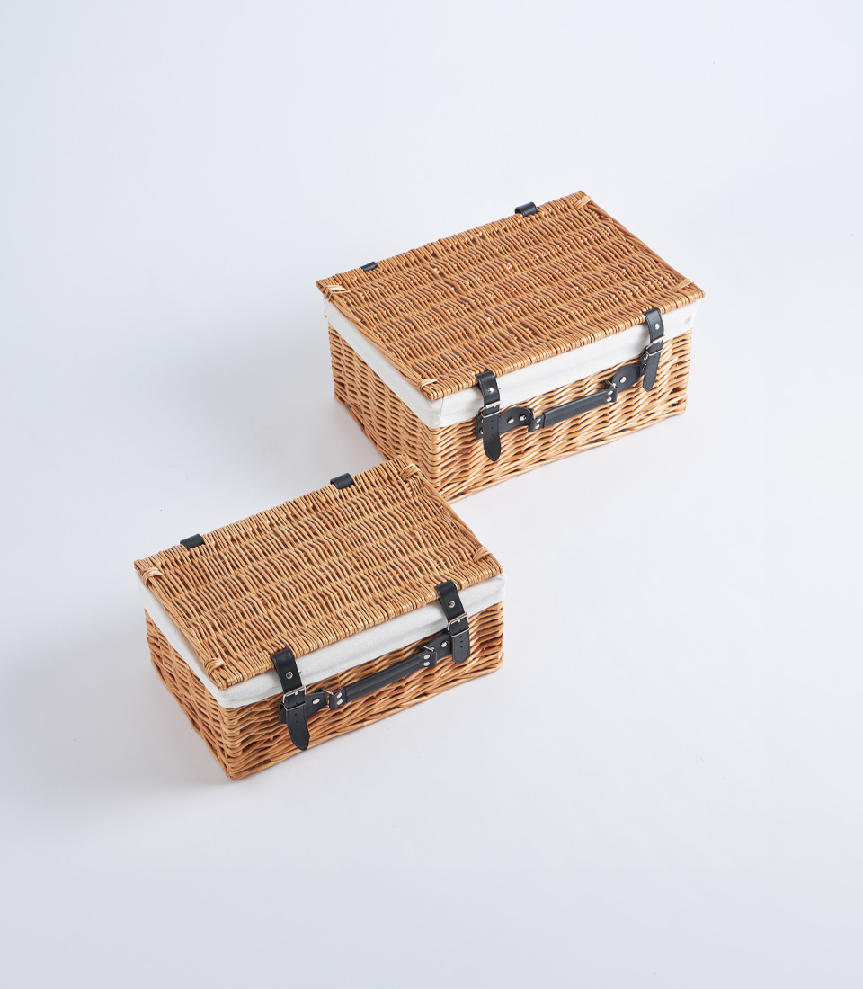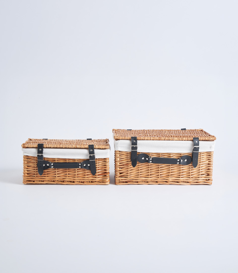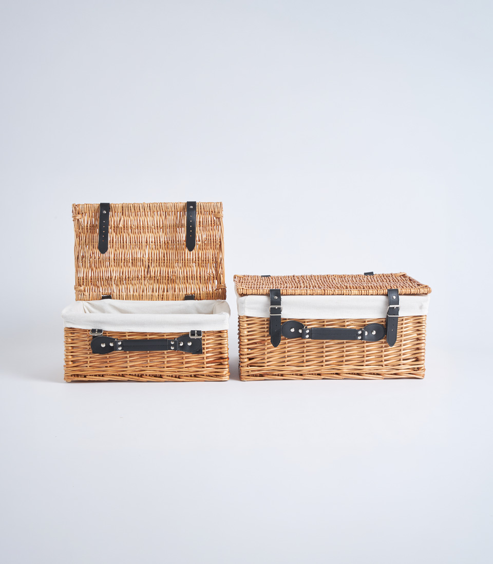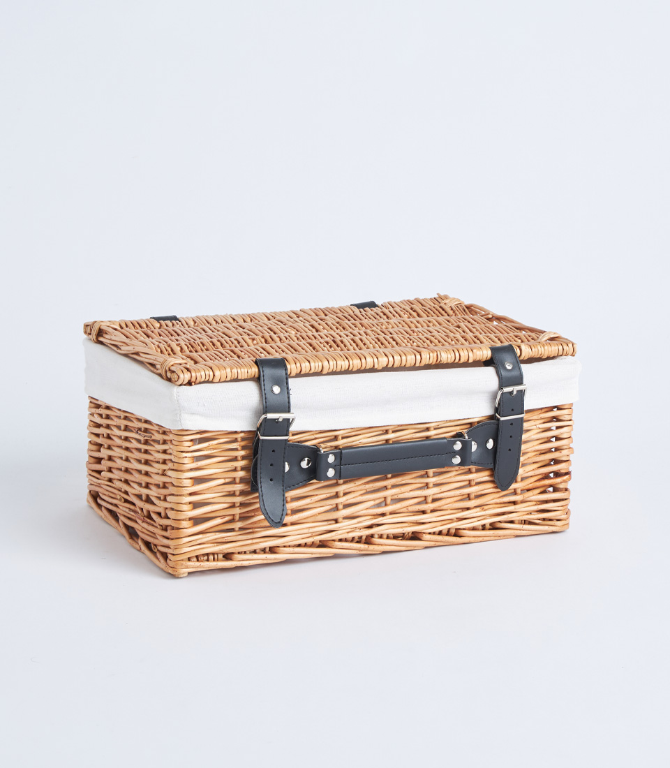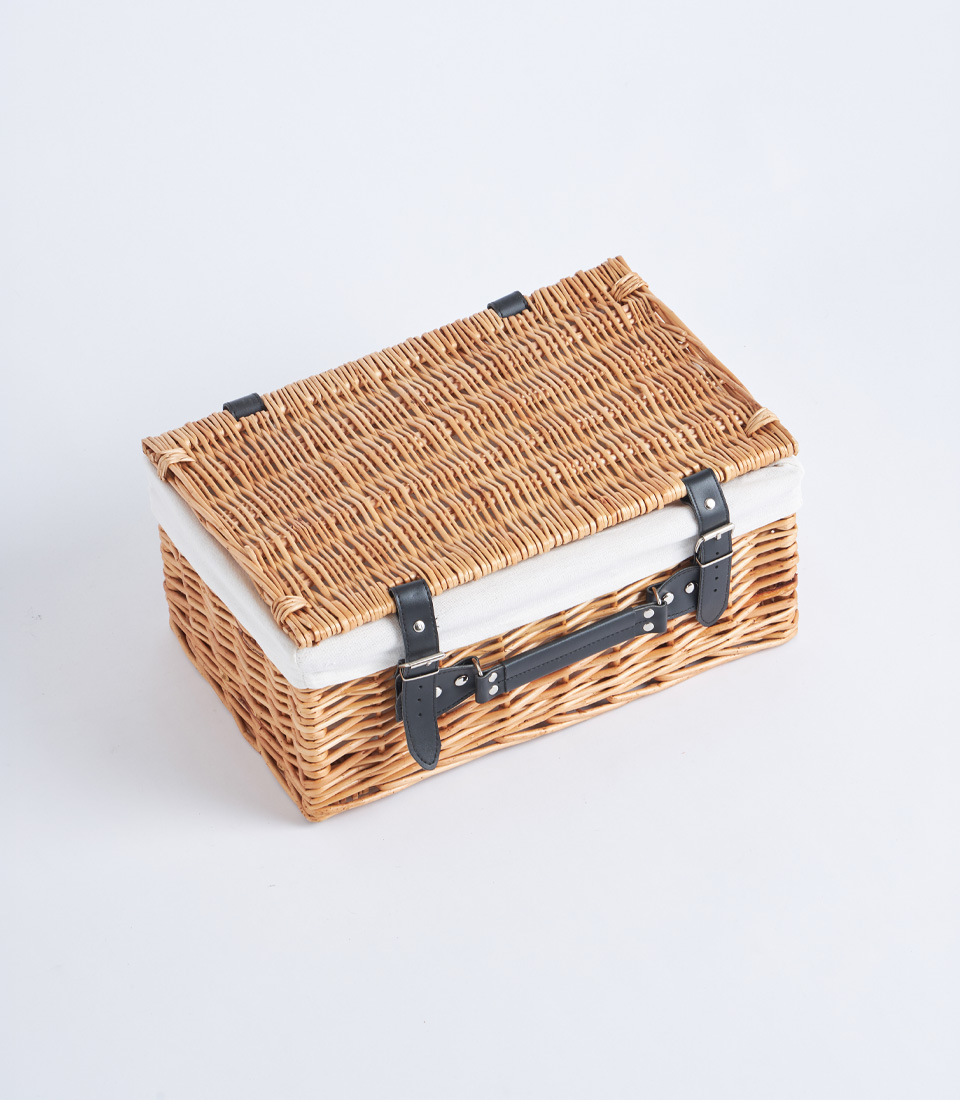 A classic wicker picnic hamper case with lid, leather straps, and fabric lining, designed for elegant gift hampers and picnic baskets.