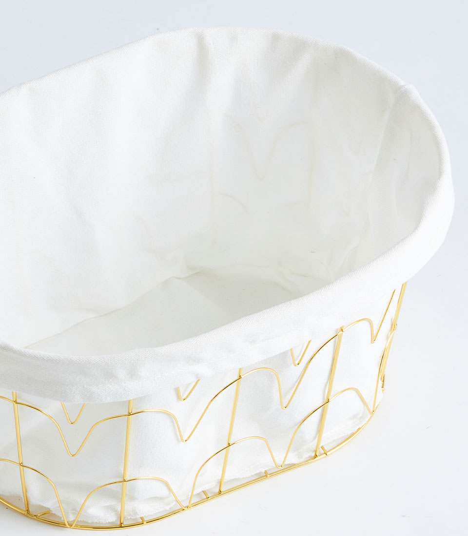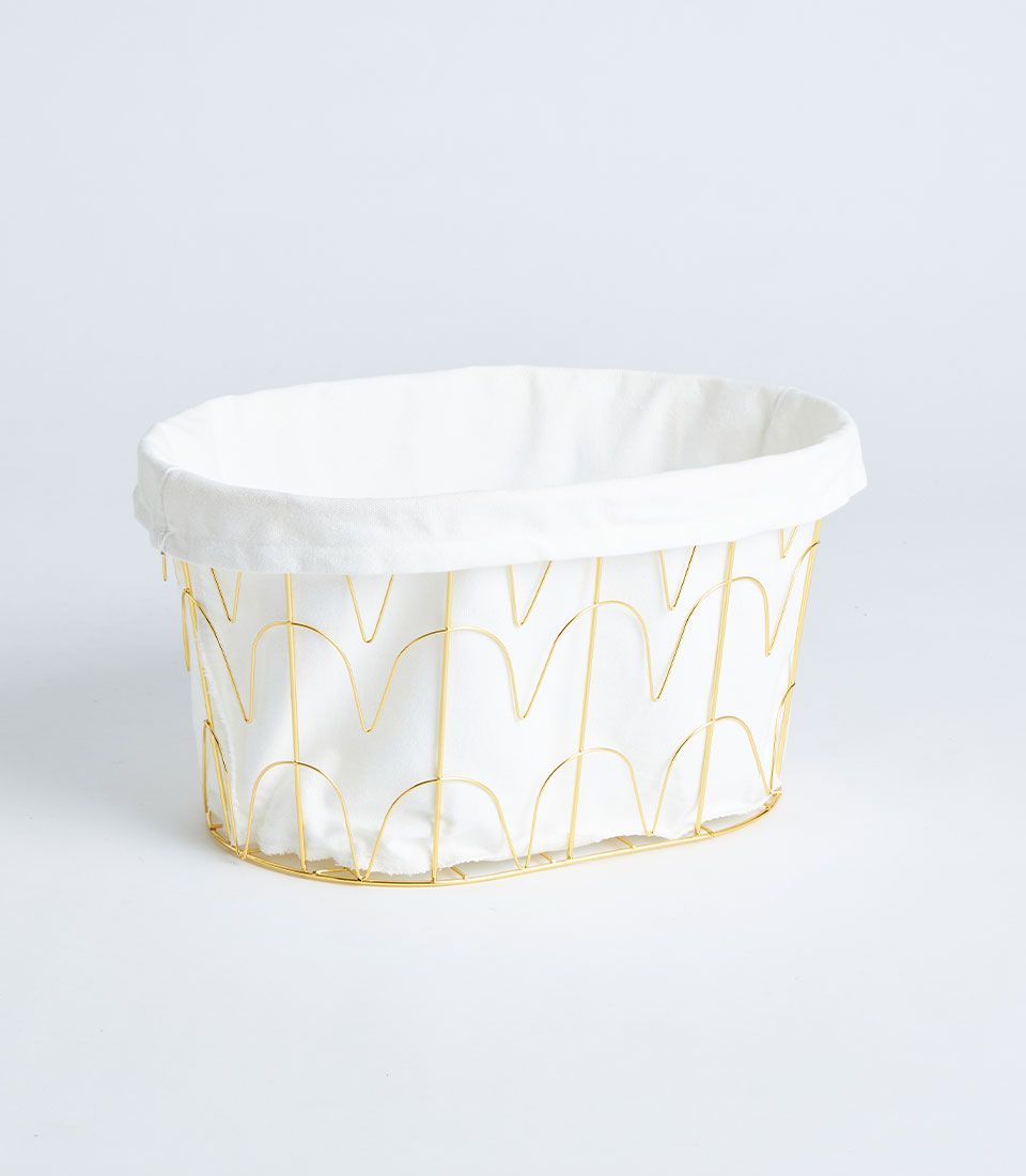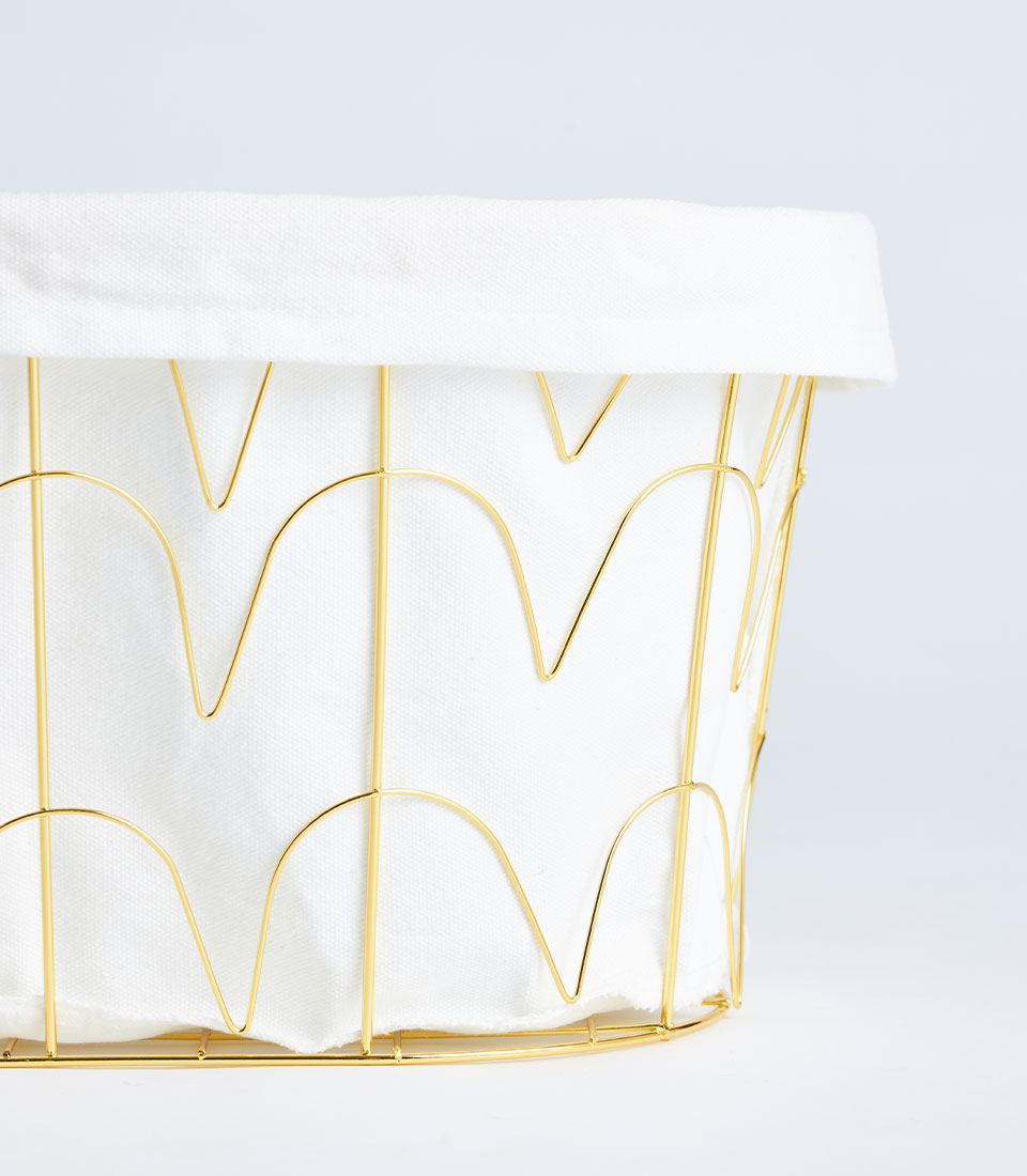 This basket features a sturdy gold-finished metal frame structure complemented by a refined fabric lining. The open metal design adds a contemporary and luxurious touch while maintaining durability and strength.
