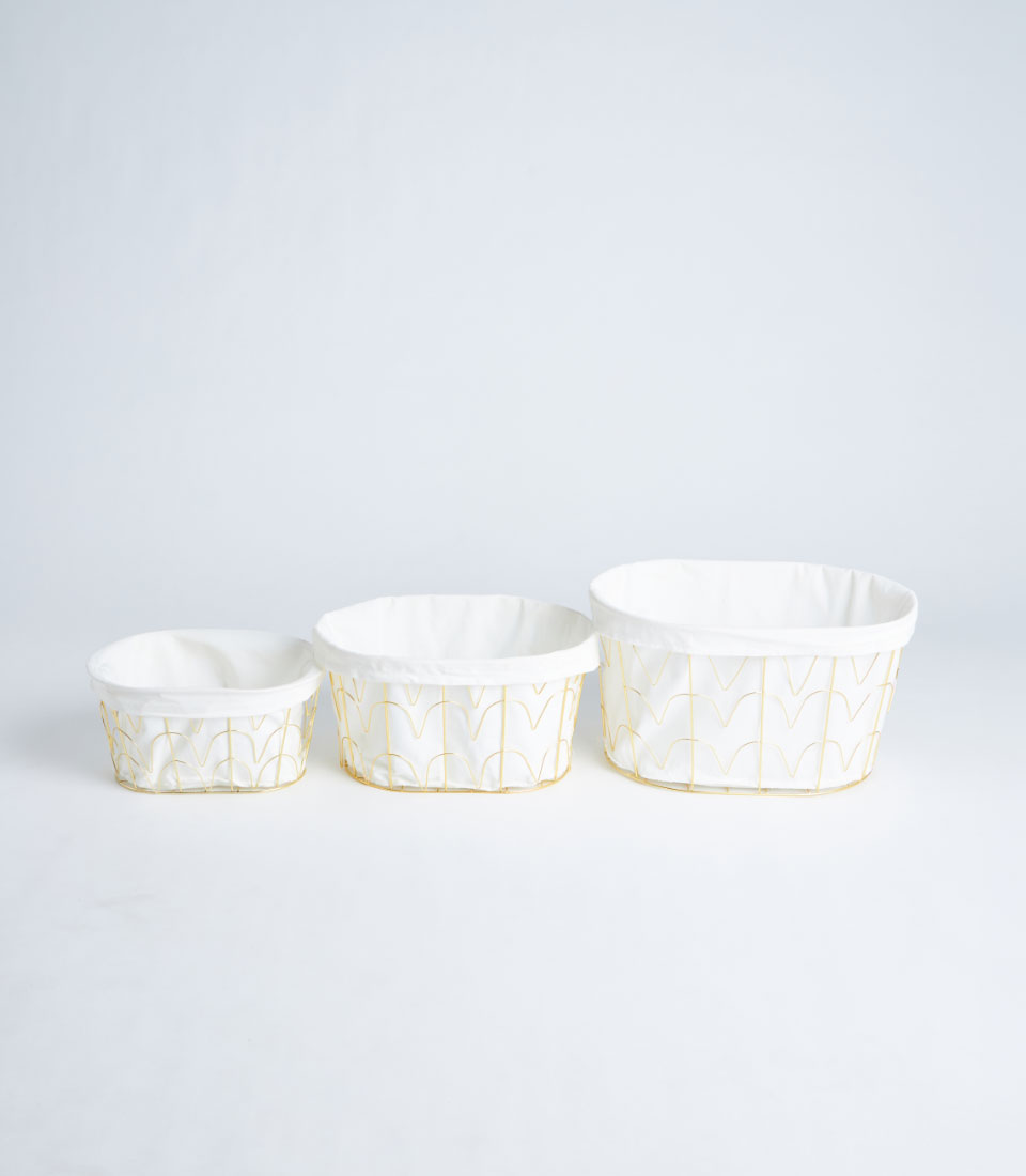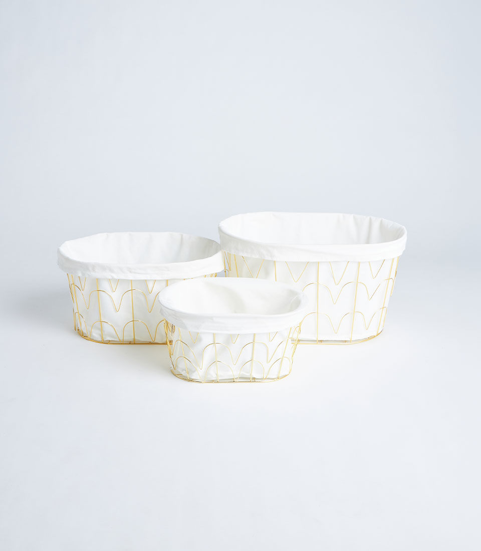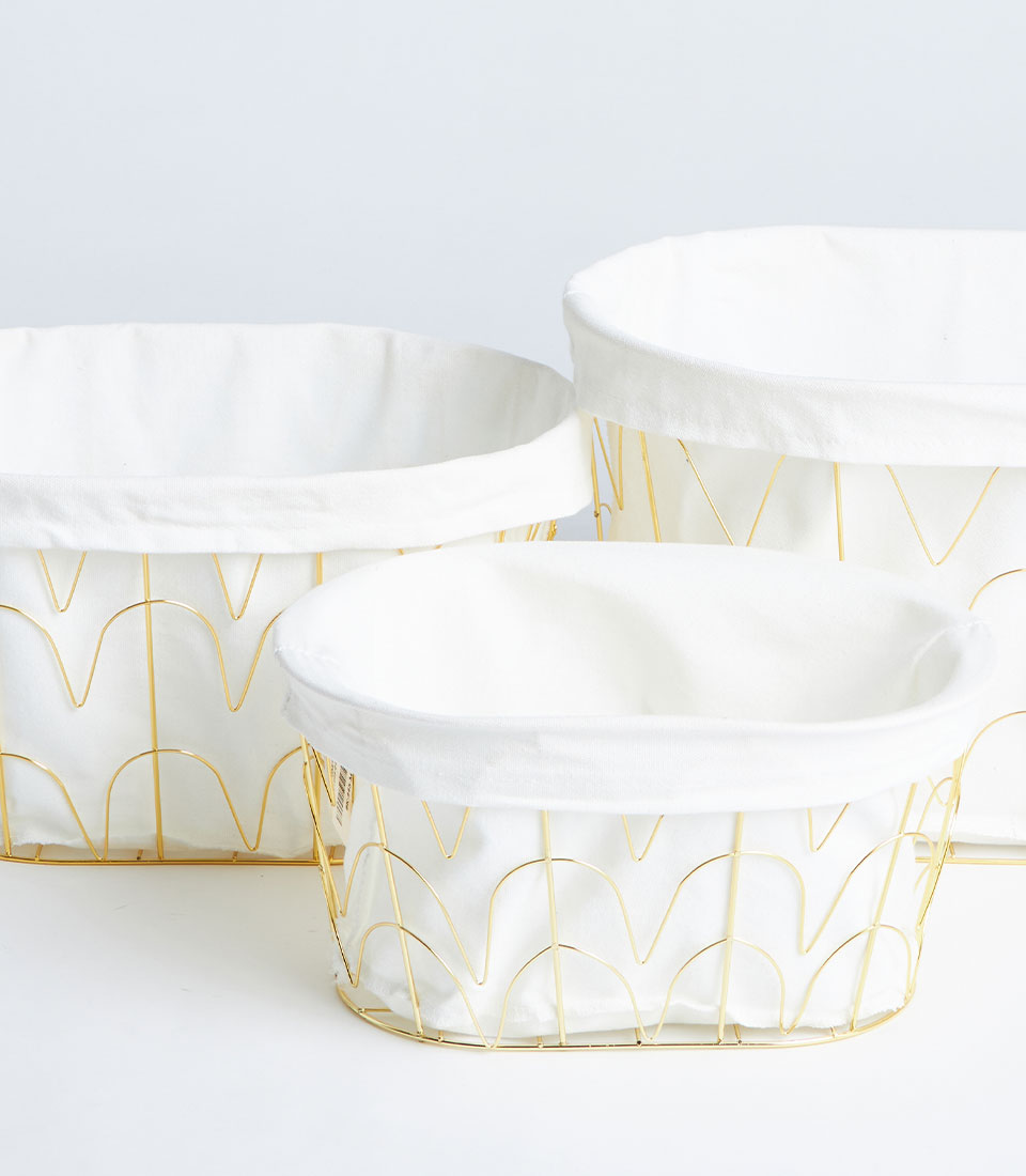 This basket features a sturdy gold-finished metal frame structure complemented by a refined fabric lining. The open metal design adds a contemporary and luxurious touch while maintaining durability and strength.
