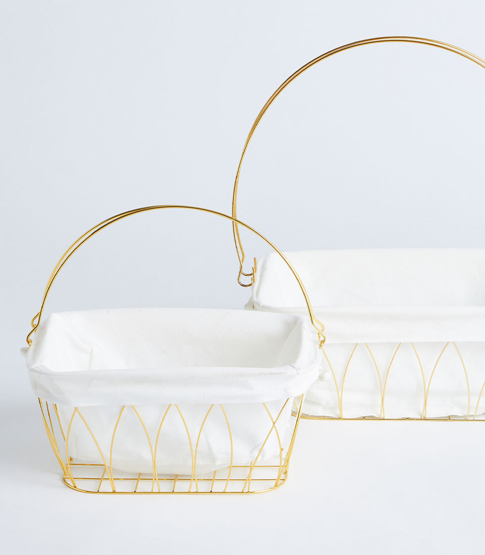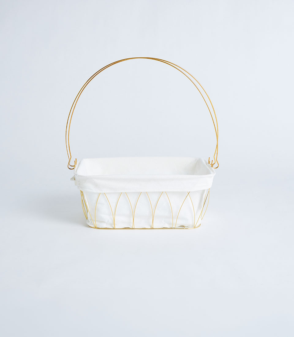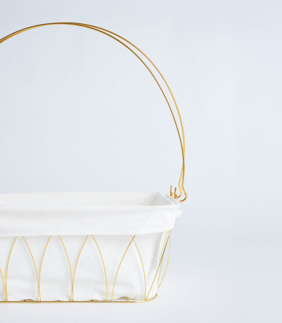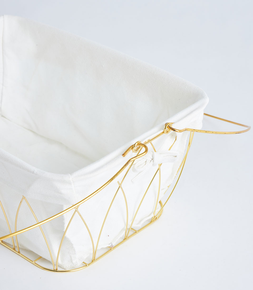 A contemporary gold metal frame basket featuring a soft removable fabric lining. Designed with a structured wire silhouette, it offers a modern and elegant base for curated gift hampers and premium presentations.
