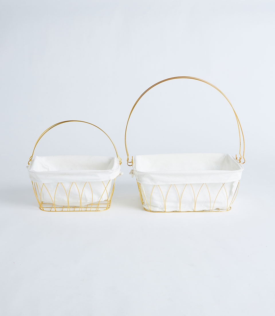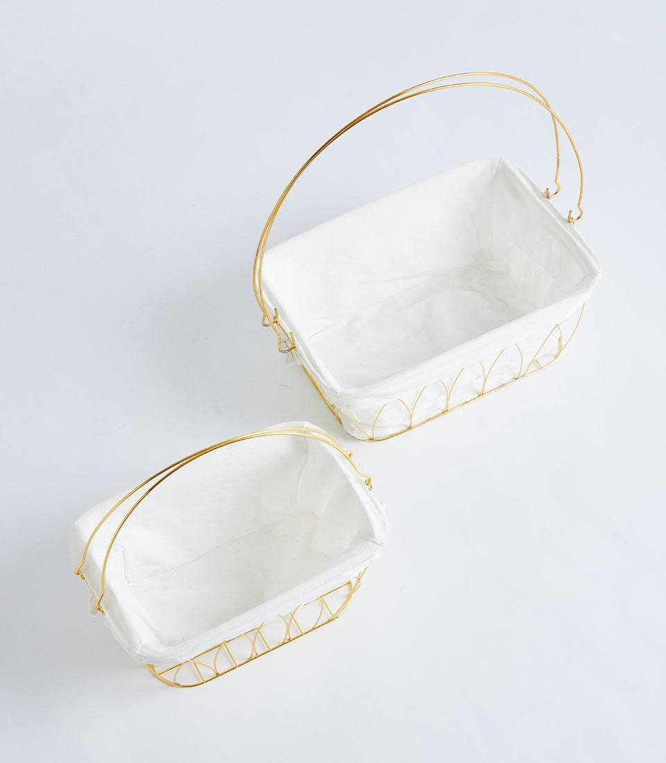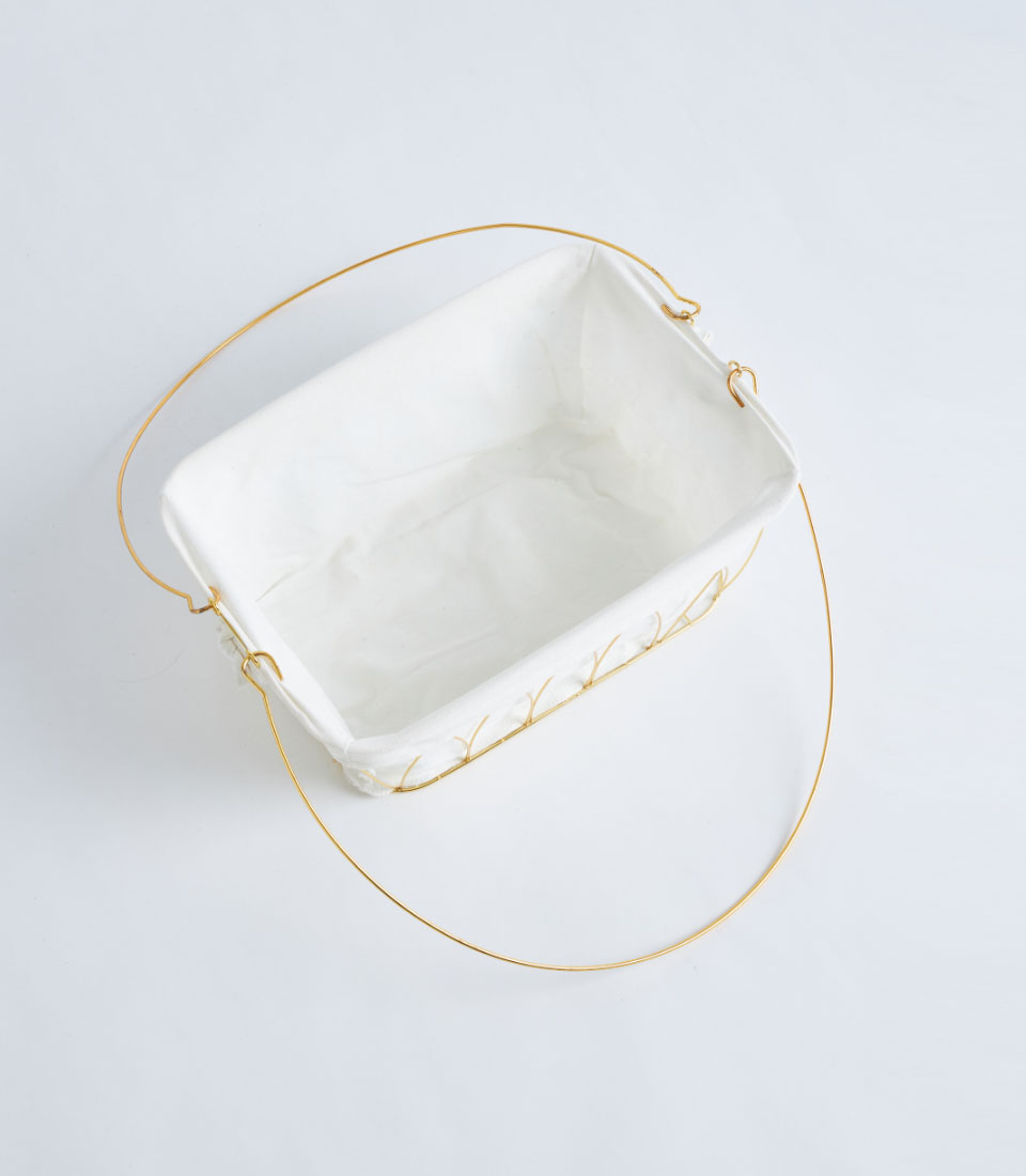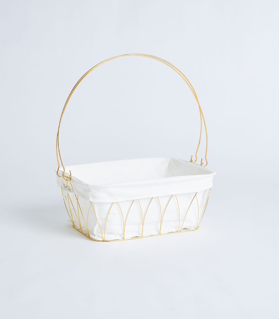 A contemporary gold metal frame basket featuring a soft removable fabric lining. Designed with a structured wire silhouette, it offers a modern and elegant base for curated gift hampers and premium presentations.