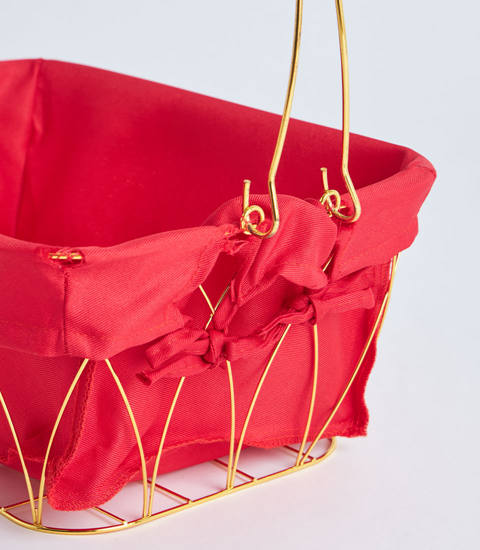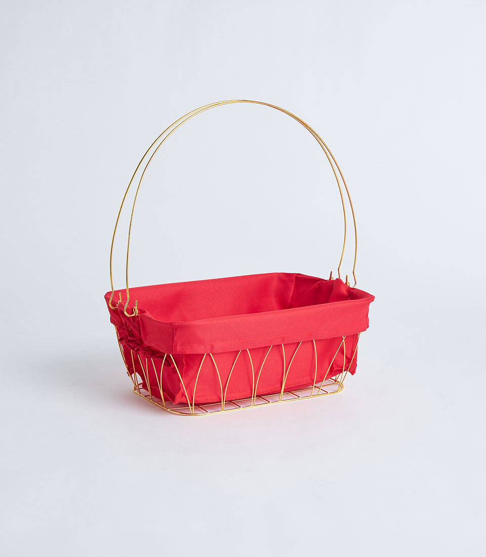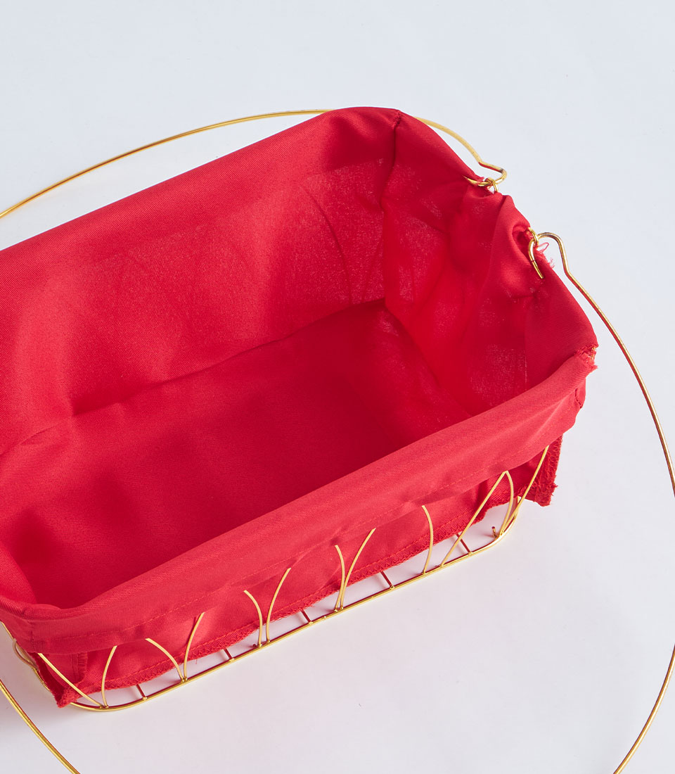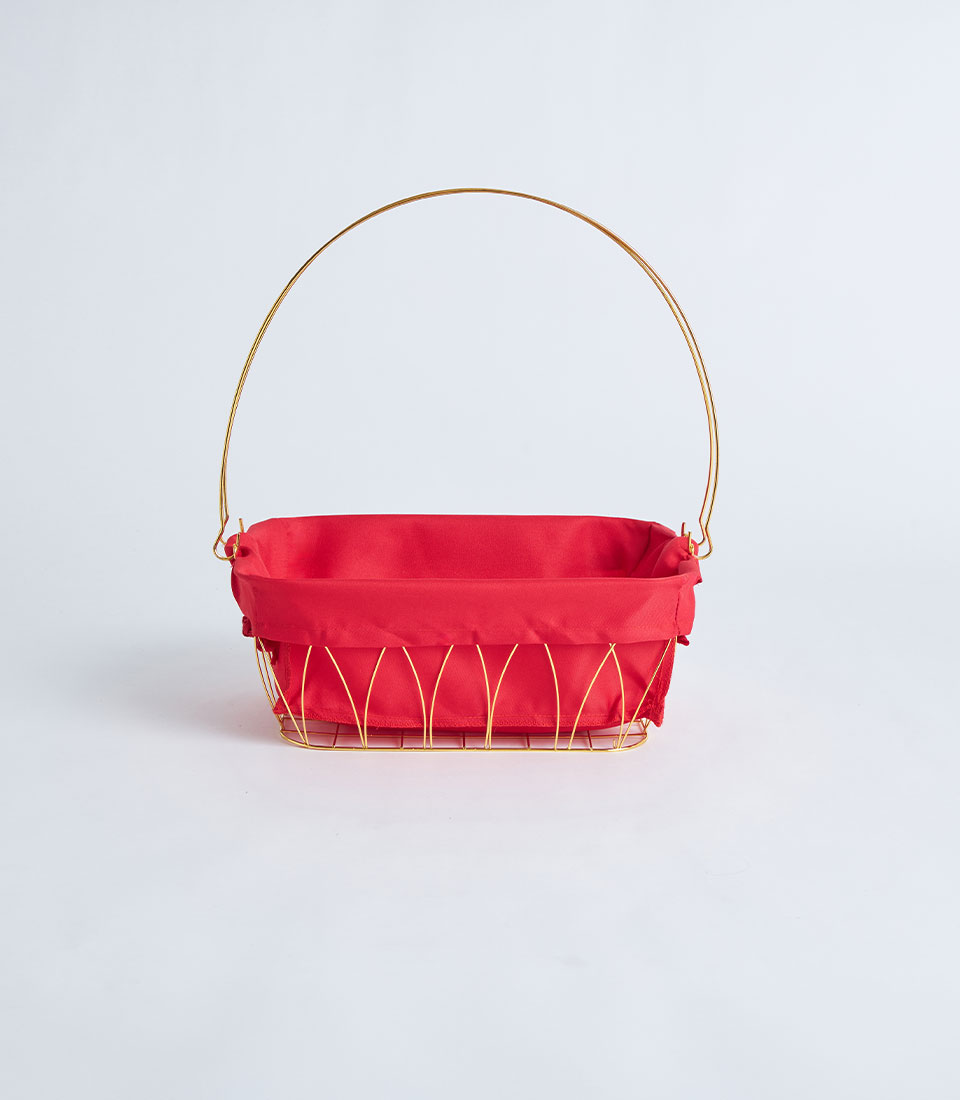 A contemporary gold metal frame basket featuring a bold red fabric lining. Designed with a structured wire silhouette, it creates a festive and eye-catching base for curated gift hampers and seasonal presentations.