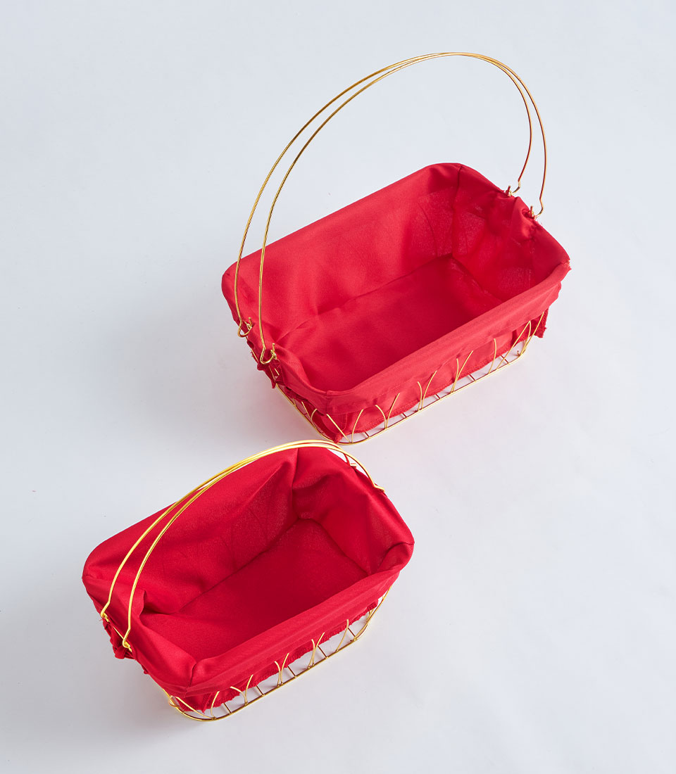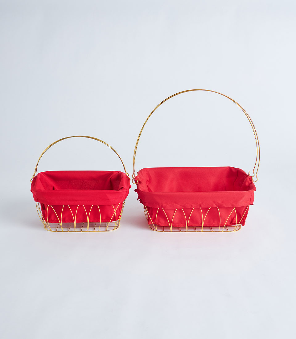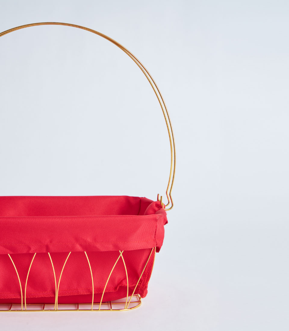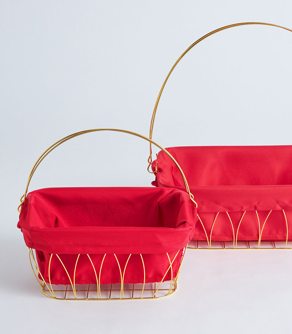 A contemporary gold metal frame basket featuring a bold red fabric lining. Designed with a structured wire silhouette, it creates a festive and eye-catching base for curated gift hampers and seasonal presentations.