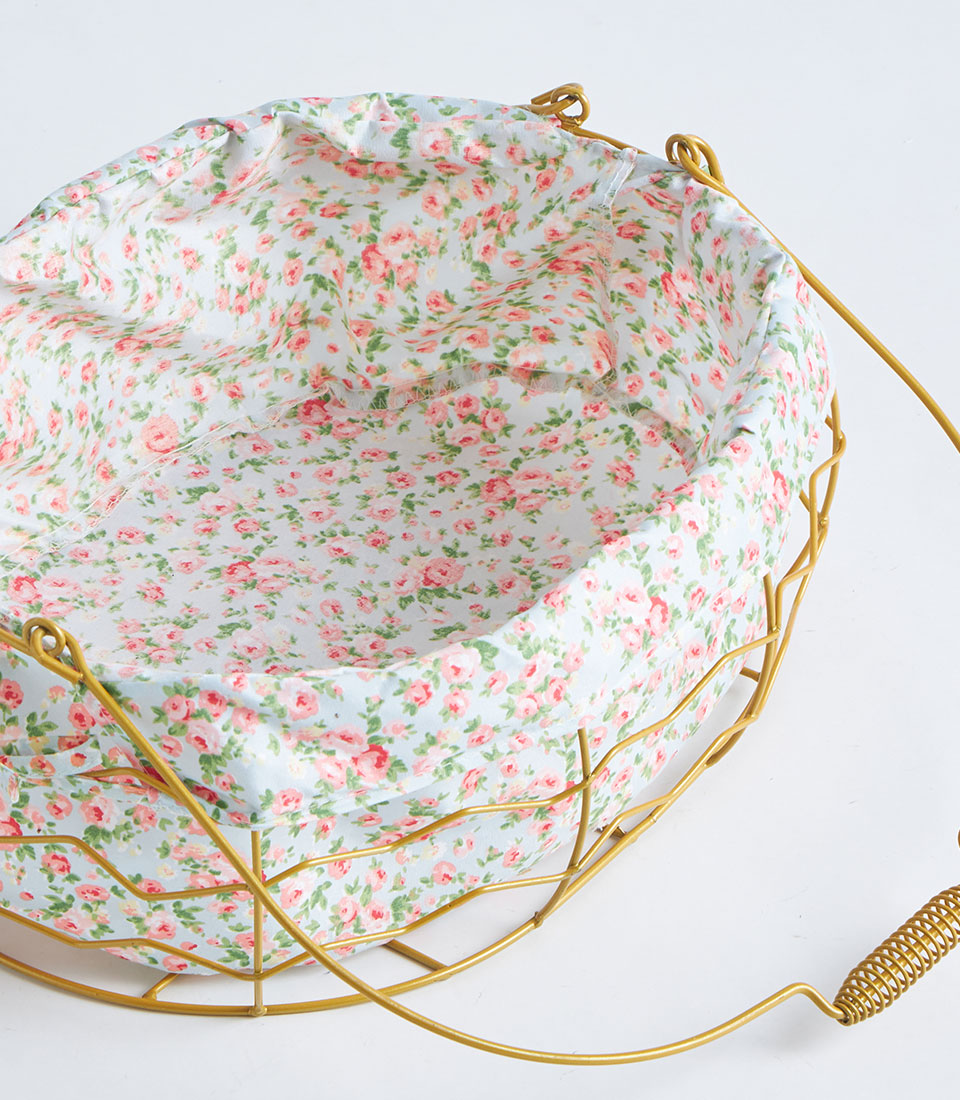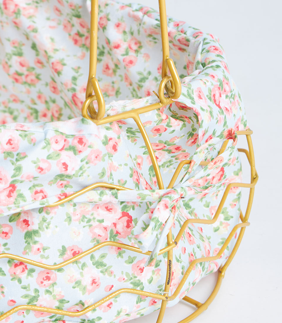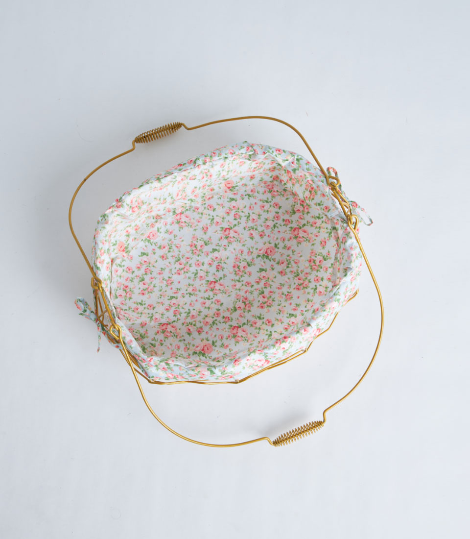 The basket is lined with soft floral fabric that folds over the rim, bringing a gentle vintage-inspired charm to the design. The tall metal handle allows convenient carrying while giving the basket a graceful and distinctive shape.