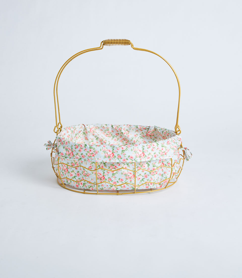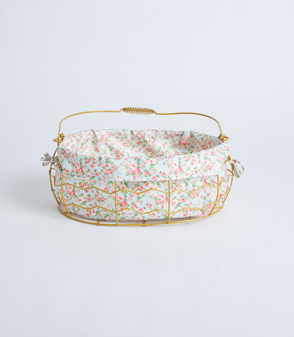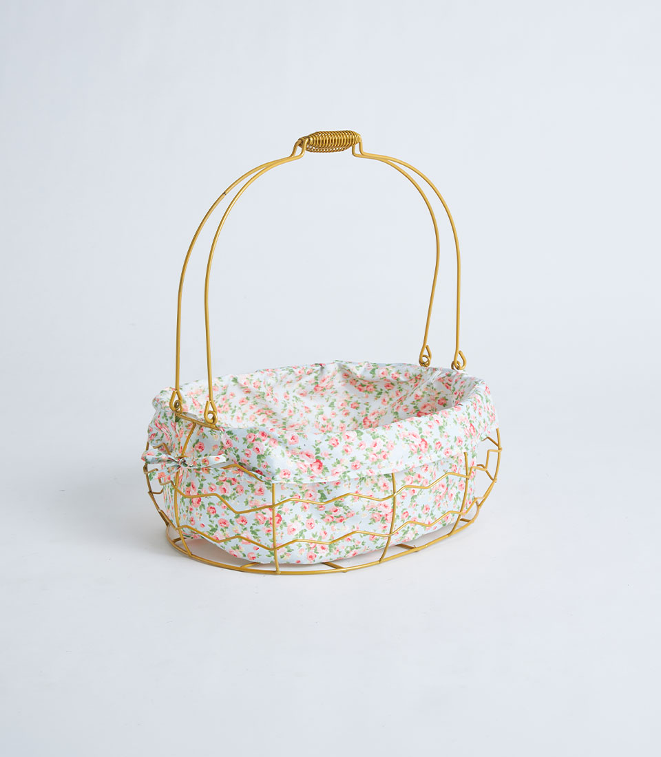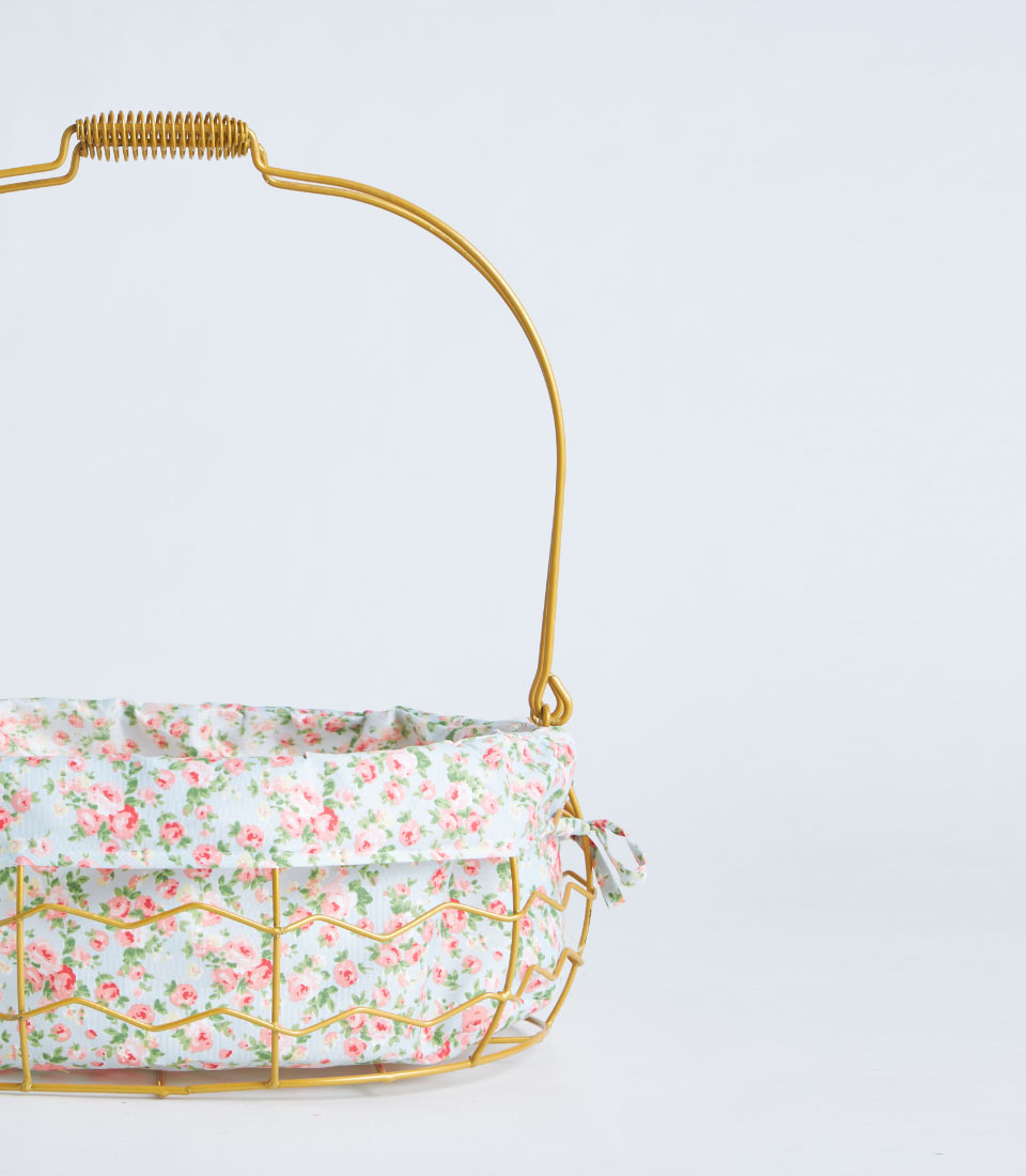 The basket is lined with soft floral fabric that folds over the rim, bringing a gentle vintage-inspired charm to the design. The tall metal handle allows convenient carrying while giving the basket a graceful and distinctive shape.