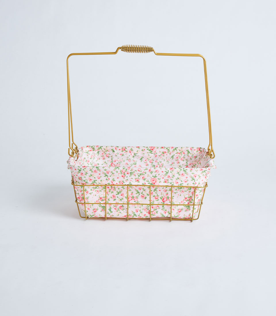 A gold metal rectangular basket with floral fabric lining and a tall handle, designed for fruit baskets, gift hampers, and elegant gift presentations.