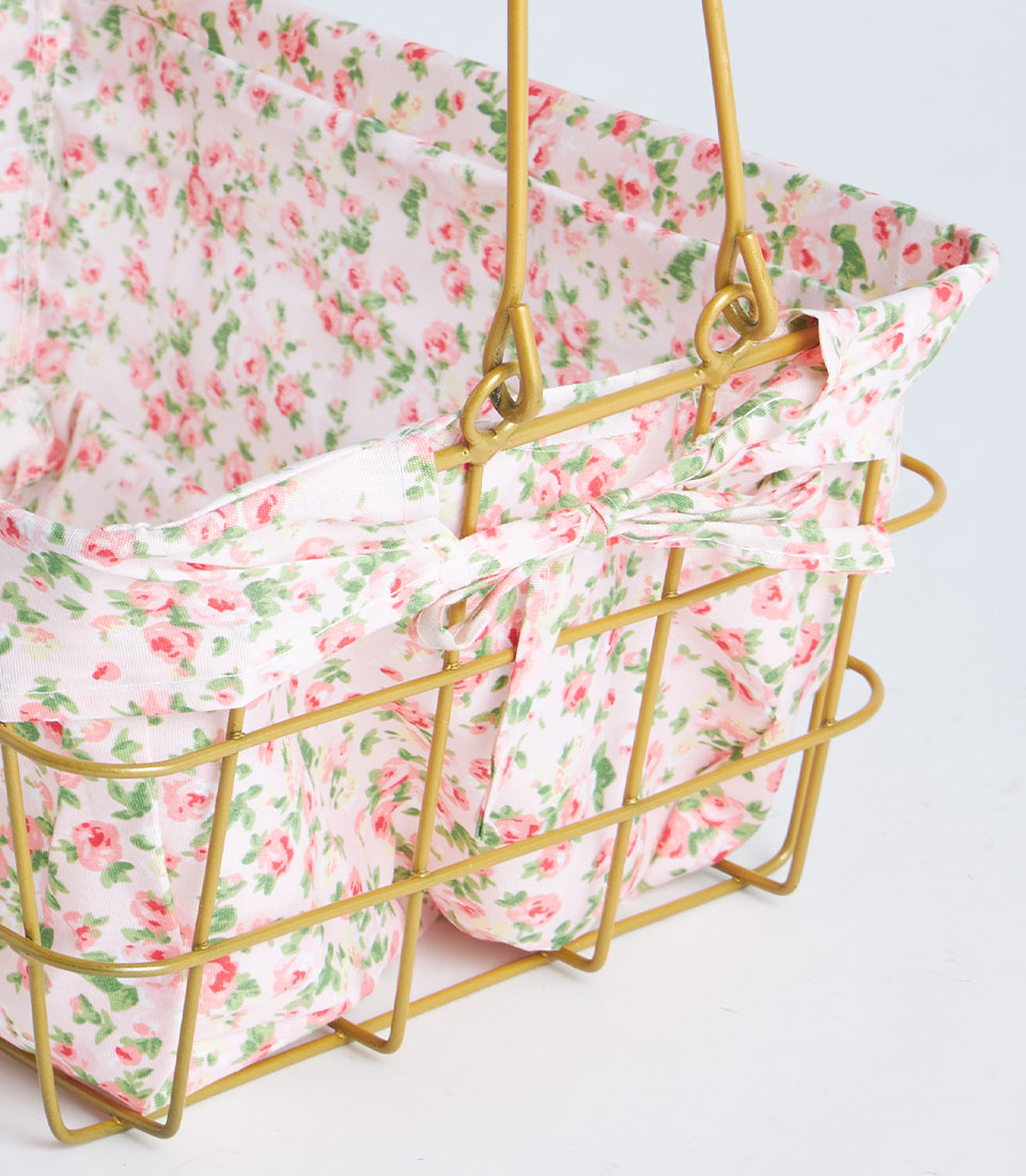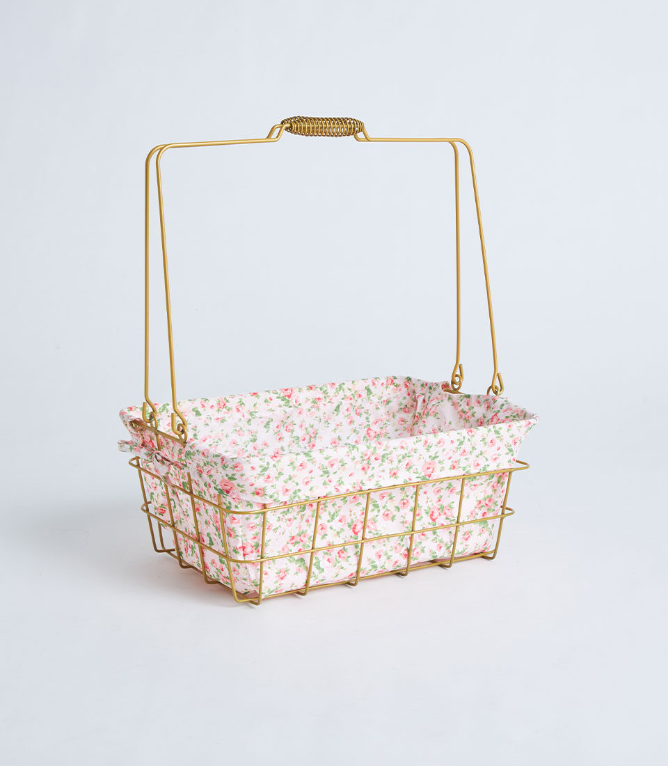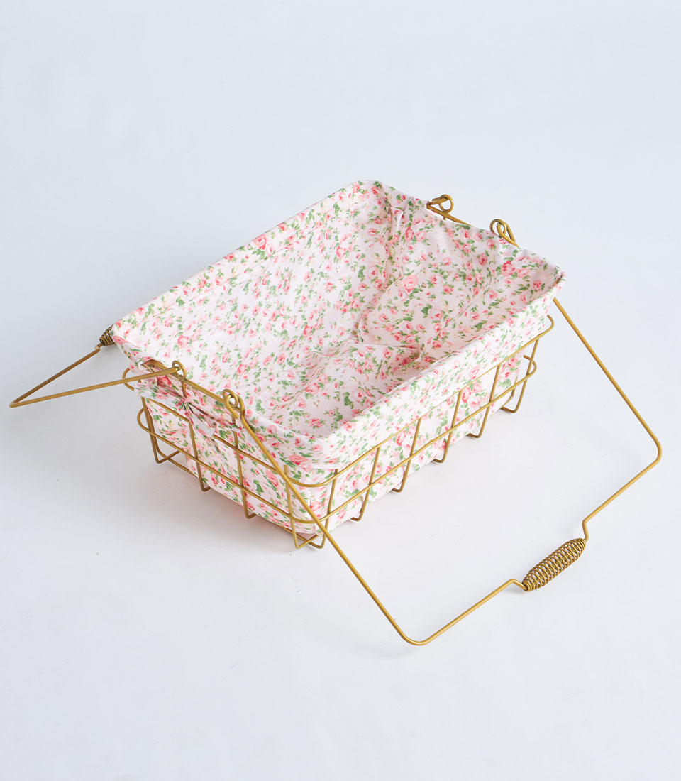 The basket is lined with soft floral fabric that folds gently over the rim, adding a charming and vintage-inspired detail to the design. The tall metal handle allows convenient carrying and enhances the graceful appearance of the basket.