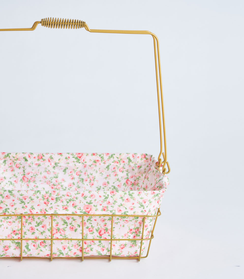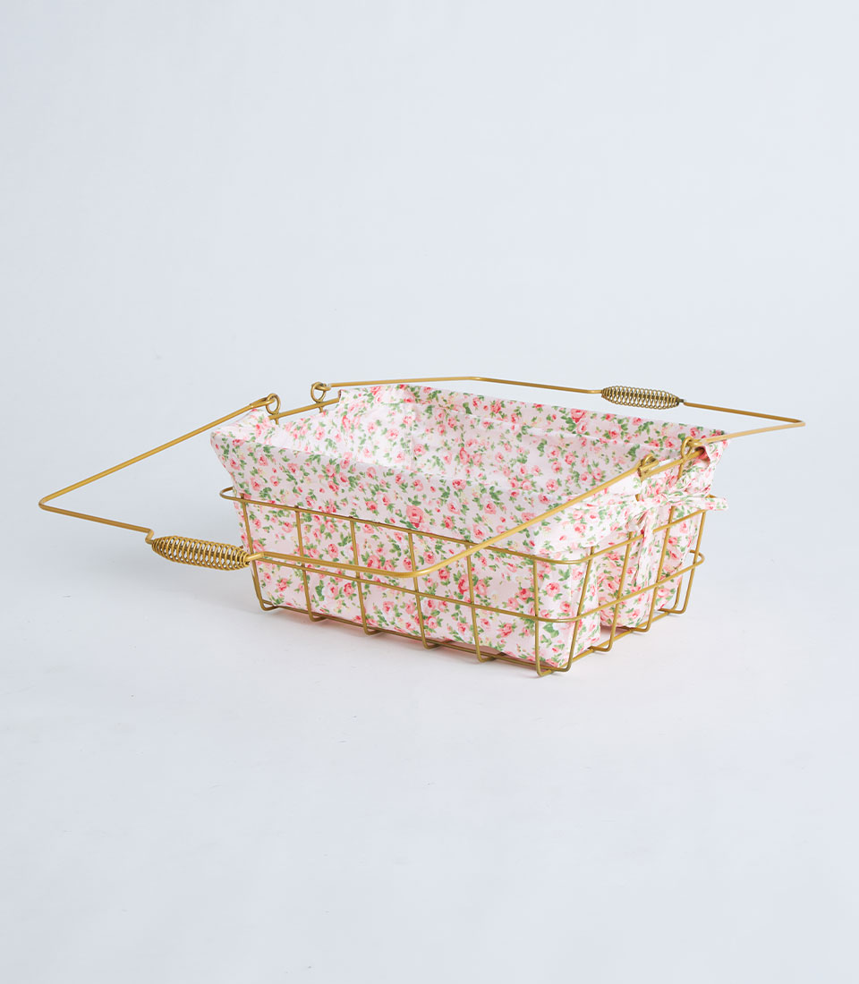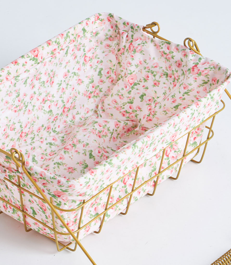 The basket is lined with soft floral fabric that folds gently over the rim, adding a charming and vintage-inspired detail to the design. The tall metal handle allows convenient carrying and enhances the graceful appearance of the basket.