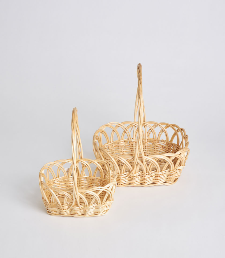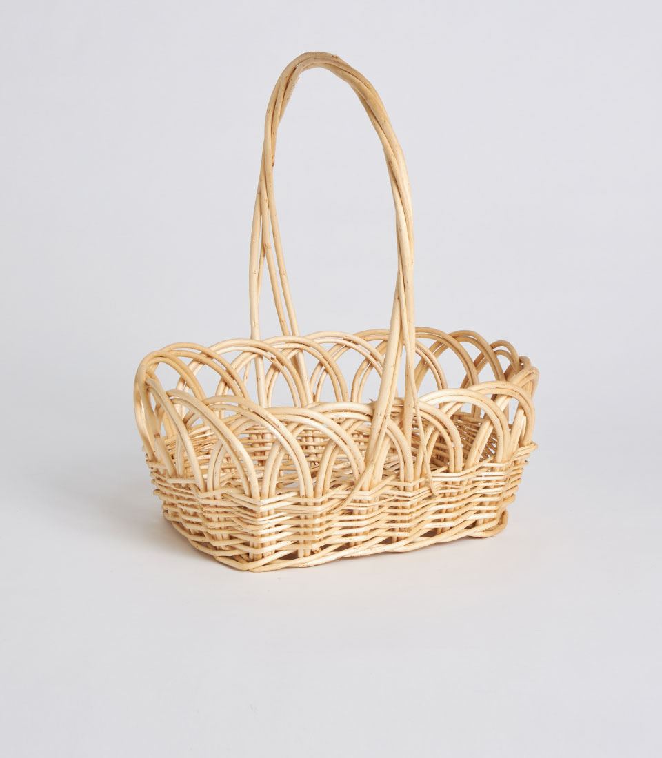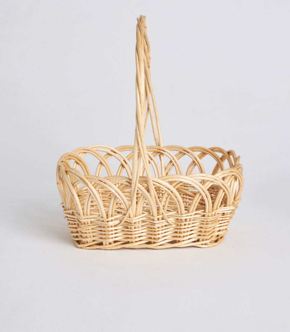 A decorative handwoven oval wicker basket featuring a tall arched handle and intricate open-weave pattern. Designed as a lightweight and elegant base for floral styling, festive gifting, and curated presentation displays.