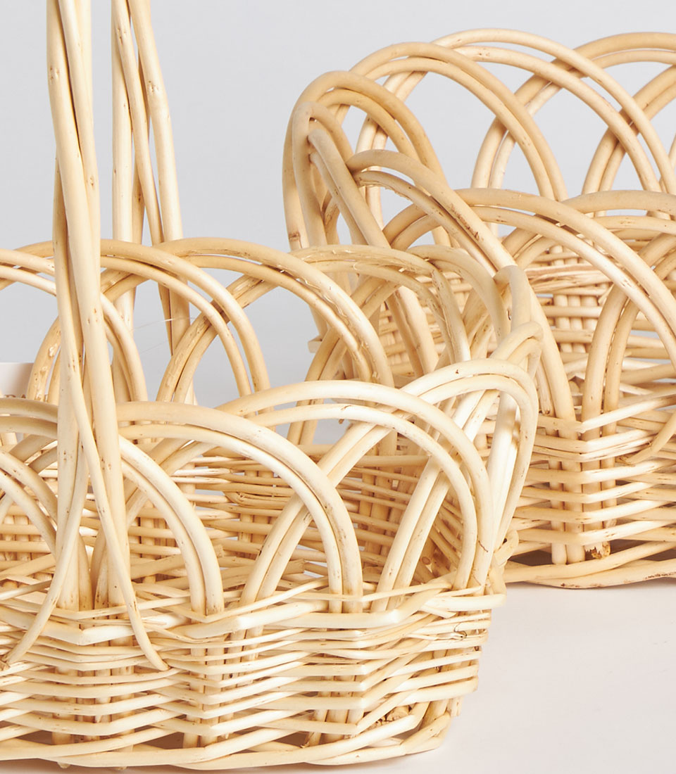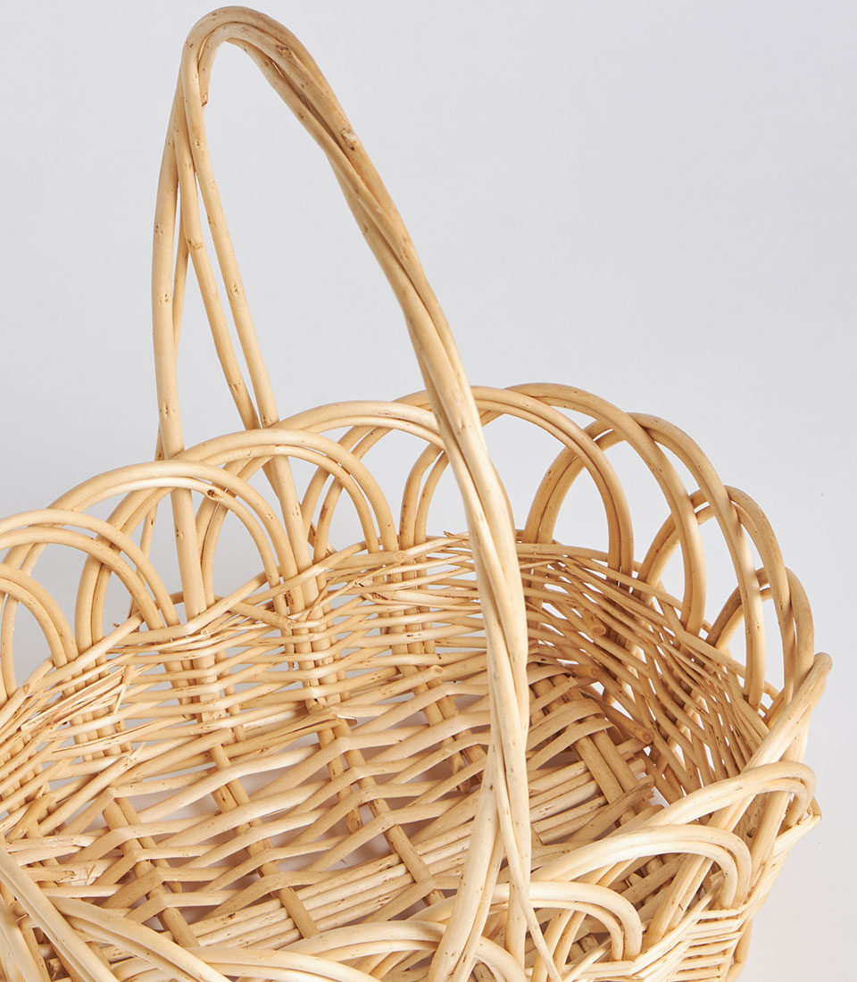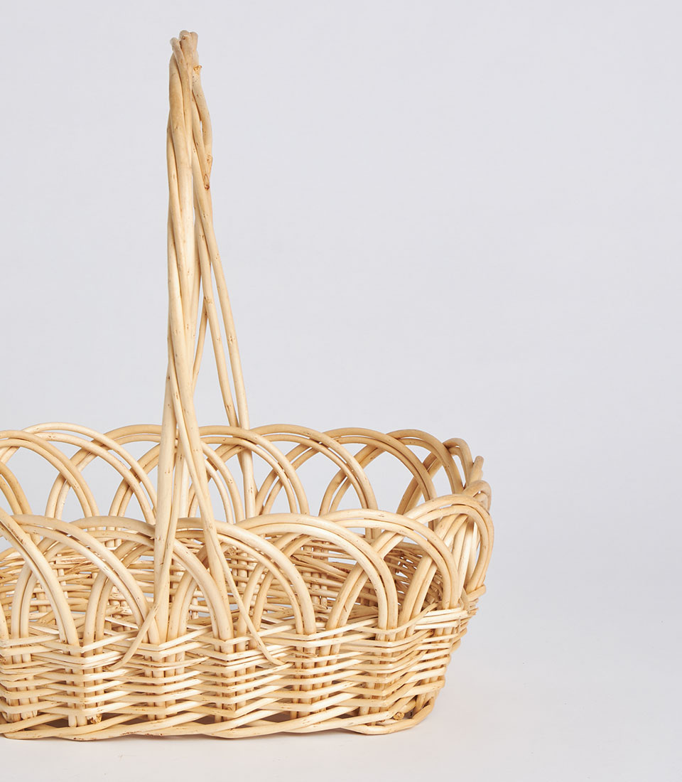 A decorative handwoven oval wicker basket featuring a tall arched handle and intricate open-weave pattern. Designed as a lightweight and elegant base for floral styling, festive gifting, and curated presentation displays.