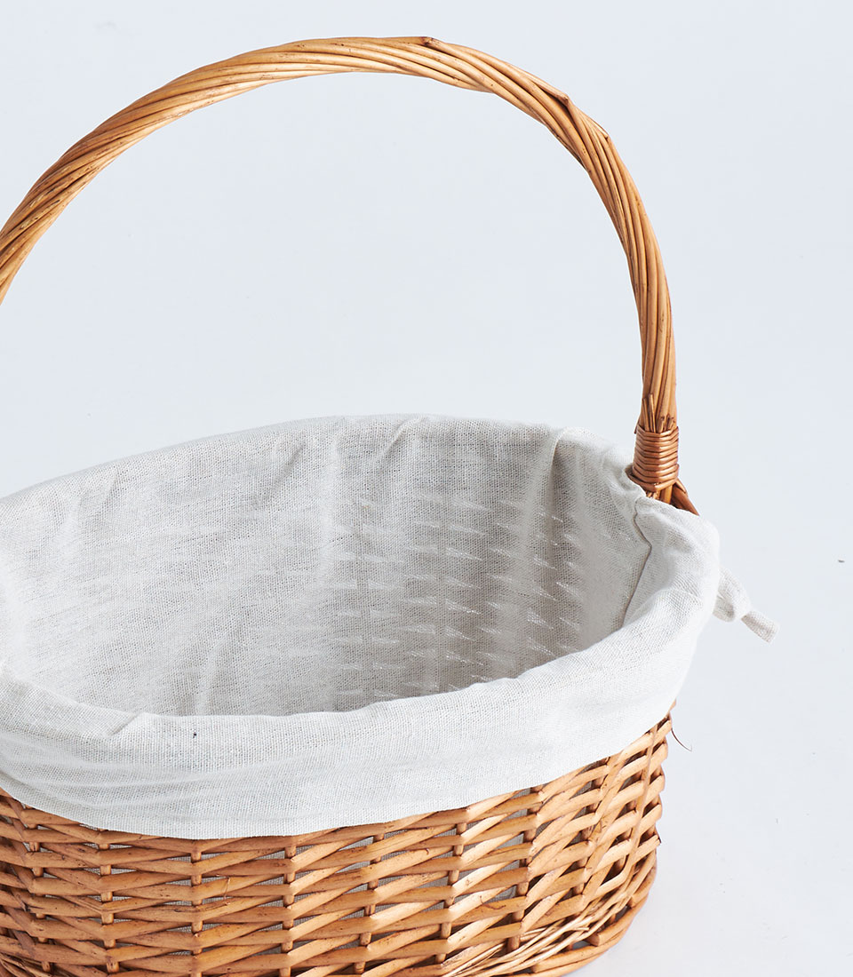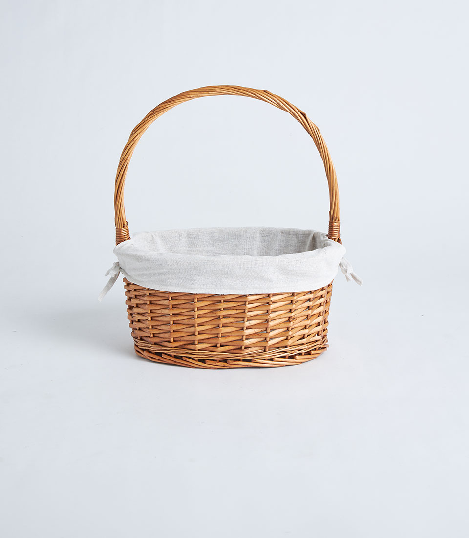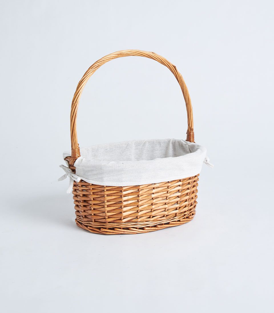 A handwoven oval wicker basket with a tall handle and soft fabric liner, designed for fruit baskets, curated hampers, and elegant gift presentations.