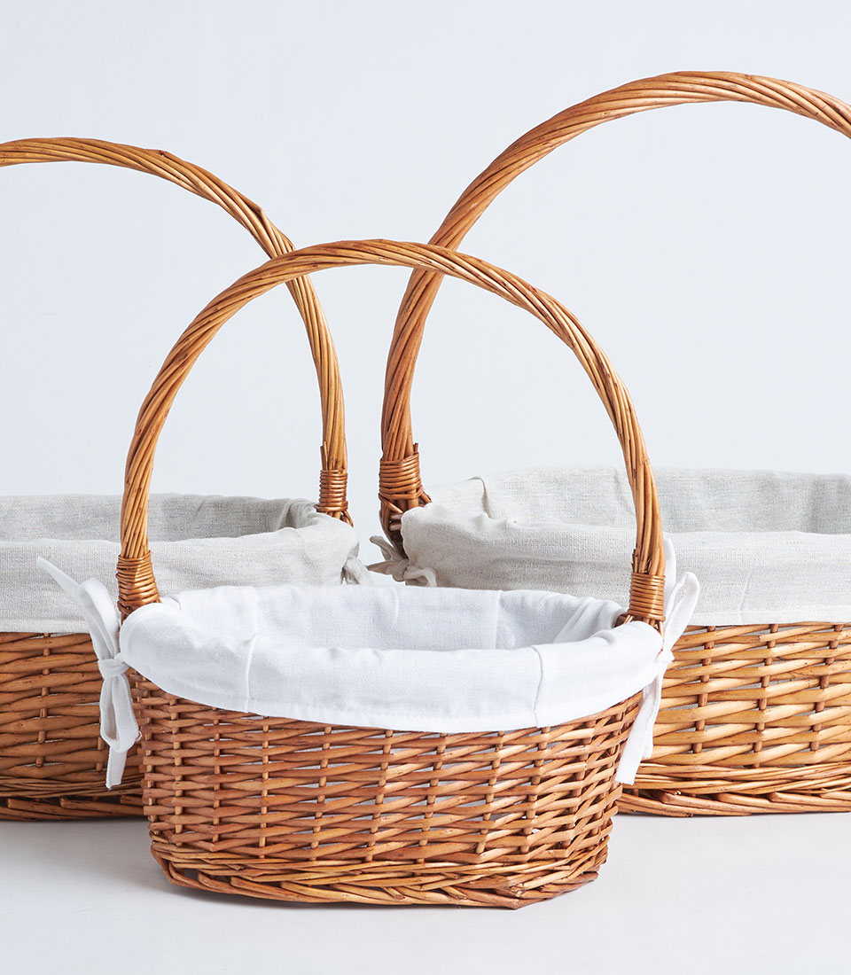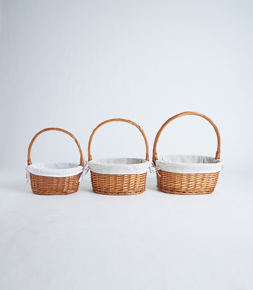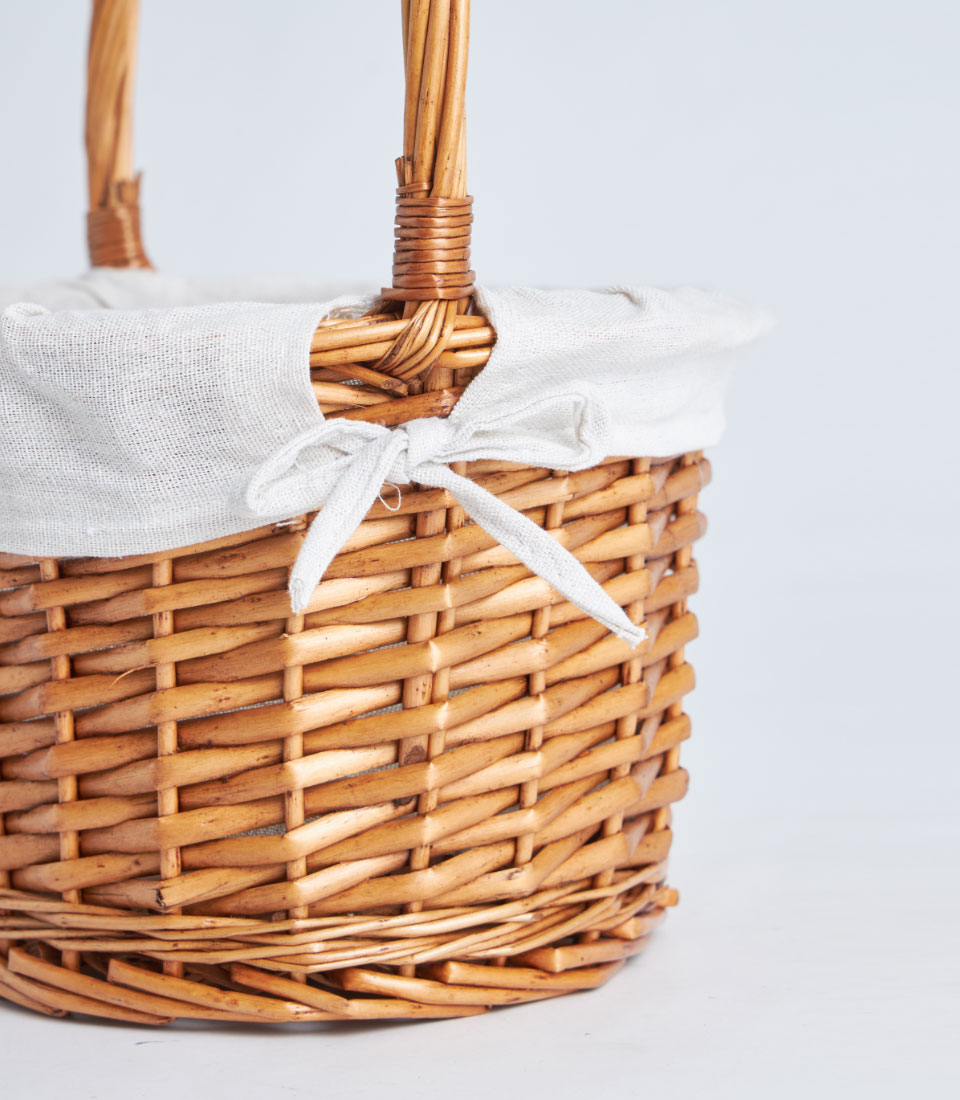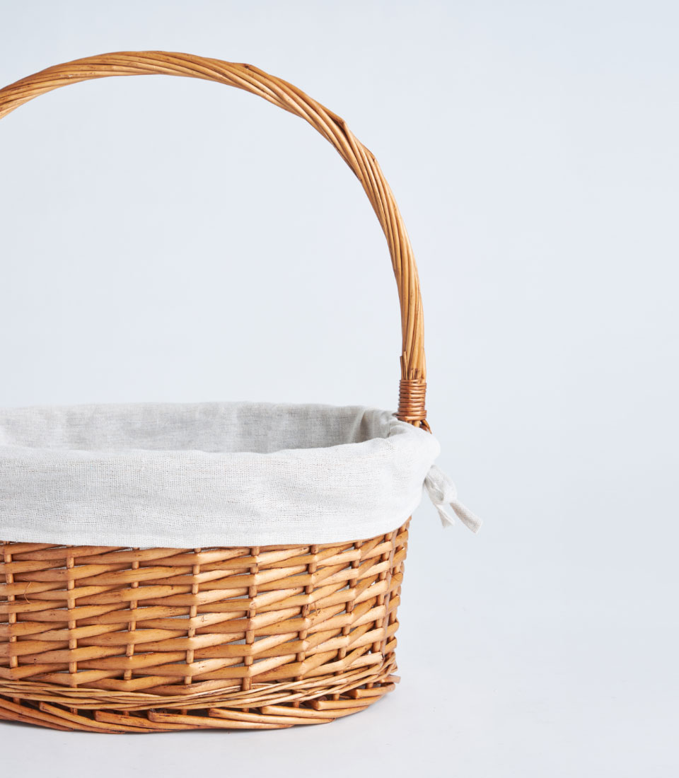 A handwoven oval wicker basket with a tall handle and soft fabric liner, designed for fruit baskets, curated hampers, and elegant gift presentations.