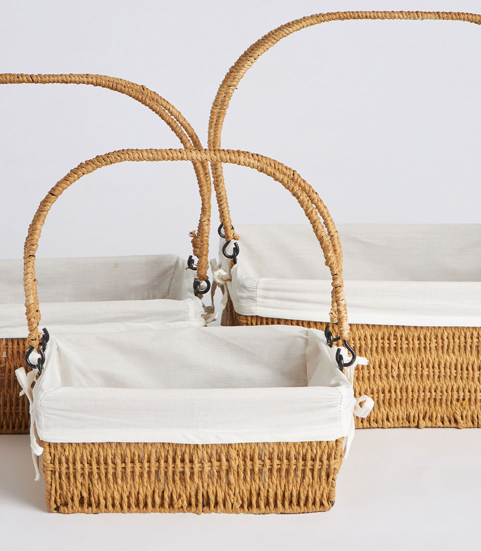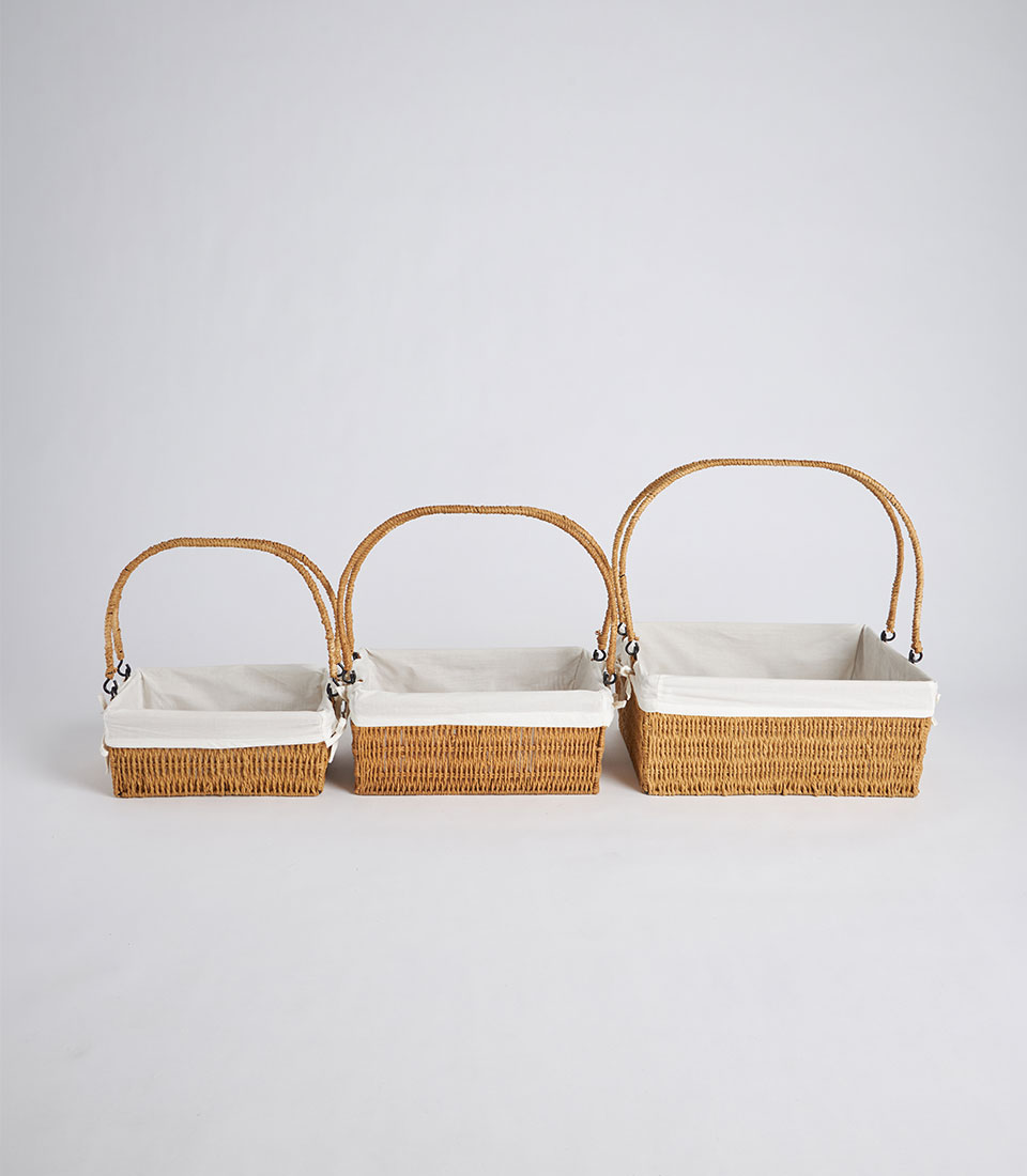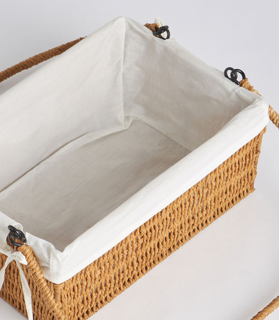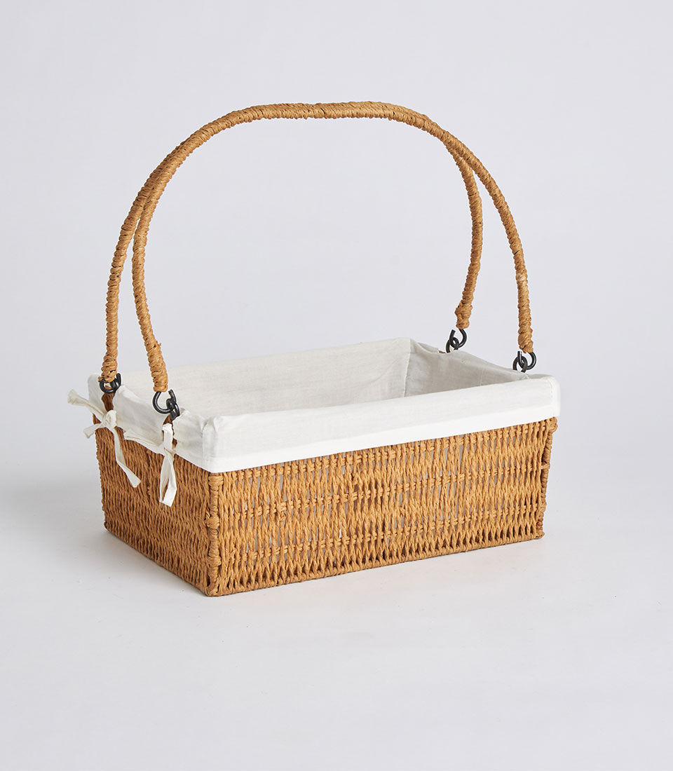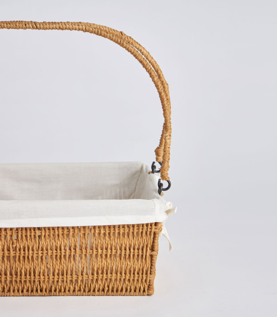 A handwoven rectangular wicker basket featuring a structured body, dual arched handles, and a removable linen liner. Designed as an elegant and versatile base for fruit hampers, festive gifting, and premium corporate presentations.