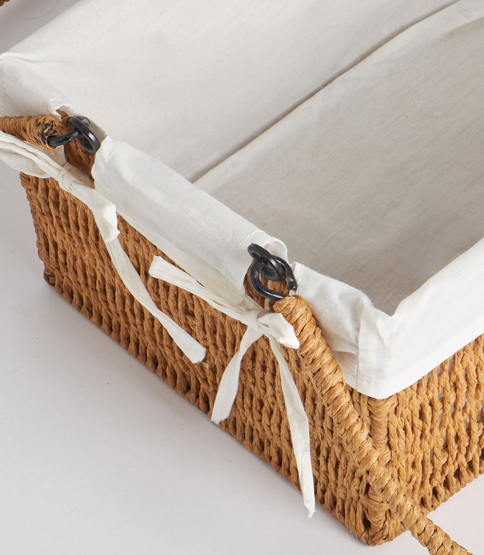 This rectangular wicker basket is crafted with a natural woven exterior complemented by dual integrated handles for balanced support and presentation. The structured silhouette ensures stability while maintaining a refined and timeless aesthetic.
