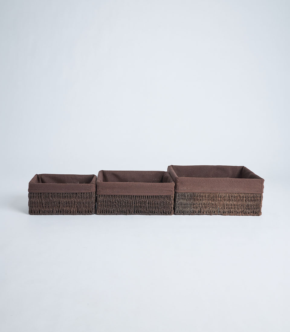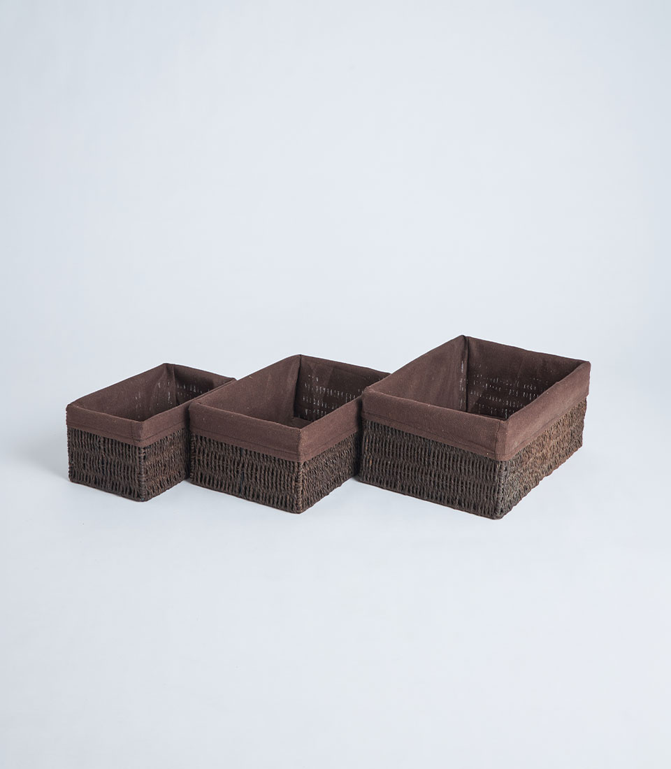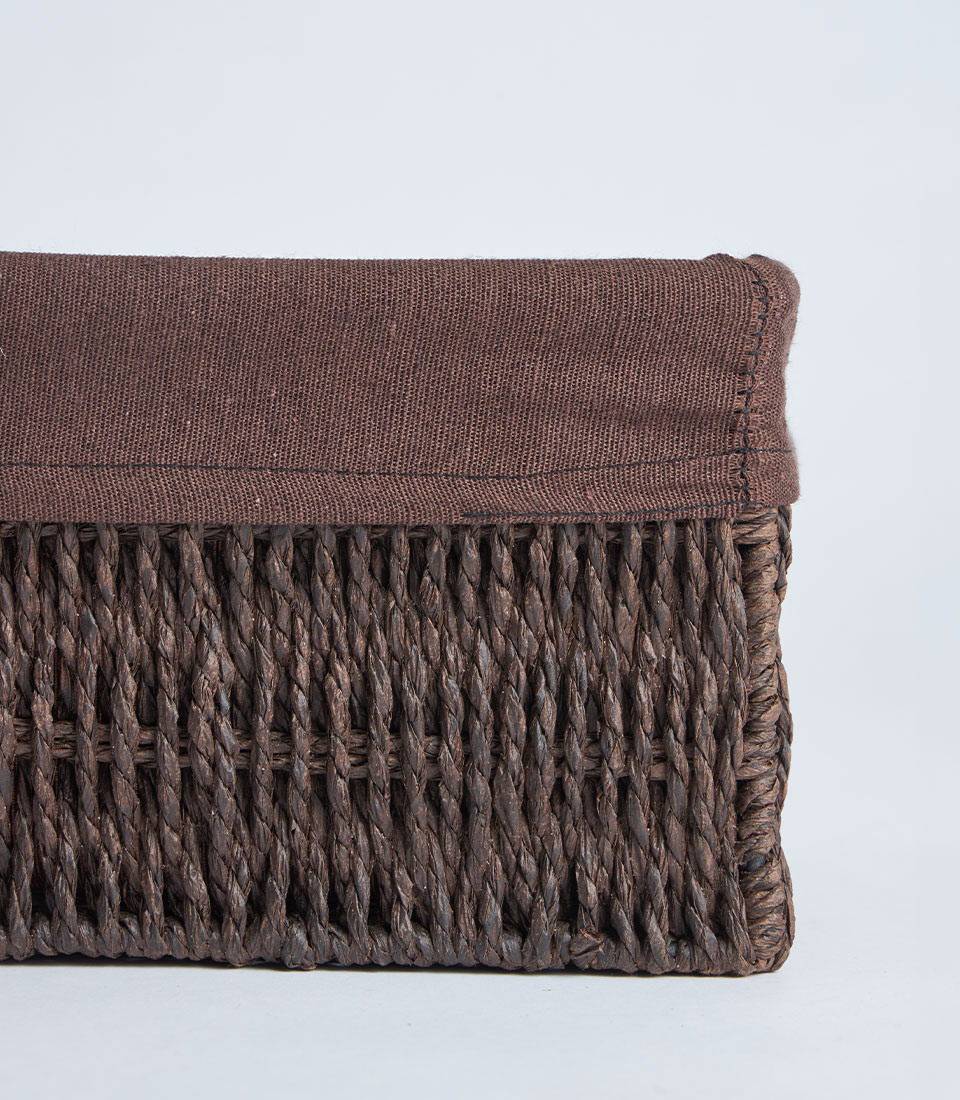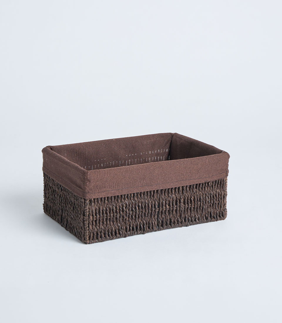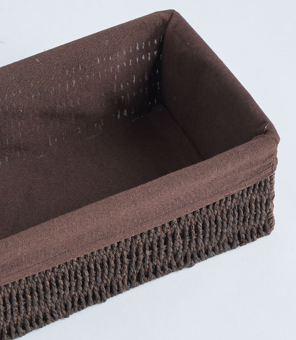 This rectangular wicker basket showcases a rich dark woven exterior paired with a coordinated fabric liner, creating a balanced and sophisticated presentation. The structured form ensures stability while maintaining a clean and timeless aesthetic.