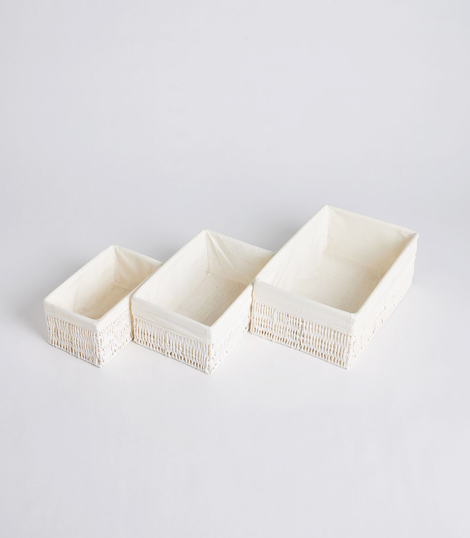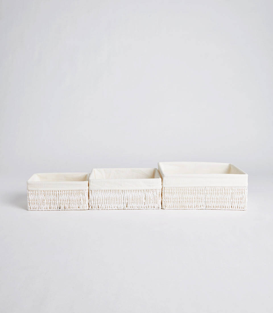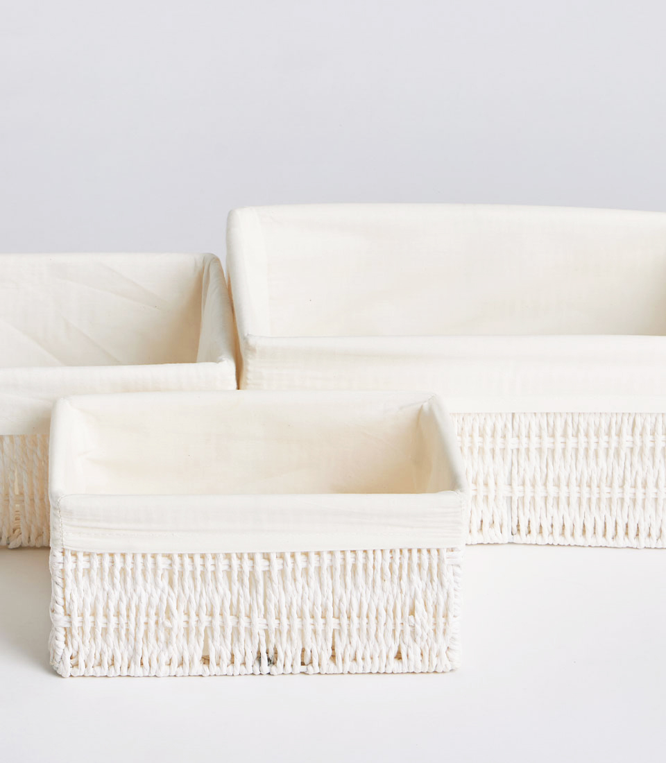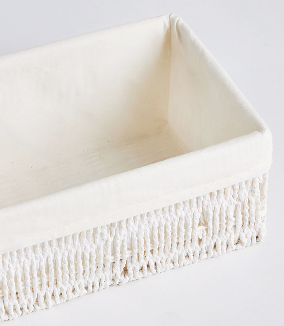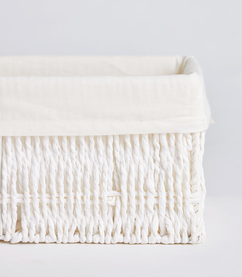 This rectangular wicker basket features a light ivory woven exterior paired with a soft neutral fabric liner, creating a fresh and refined presentation. The structured silhouette ensures stability while maintaining a minimalist aesthetic.
