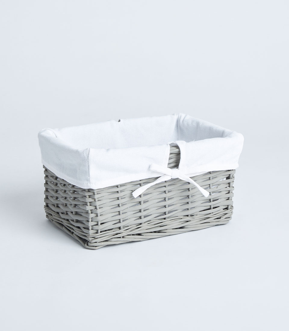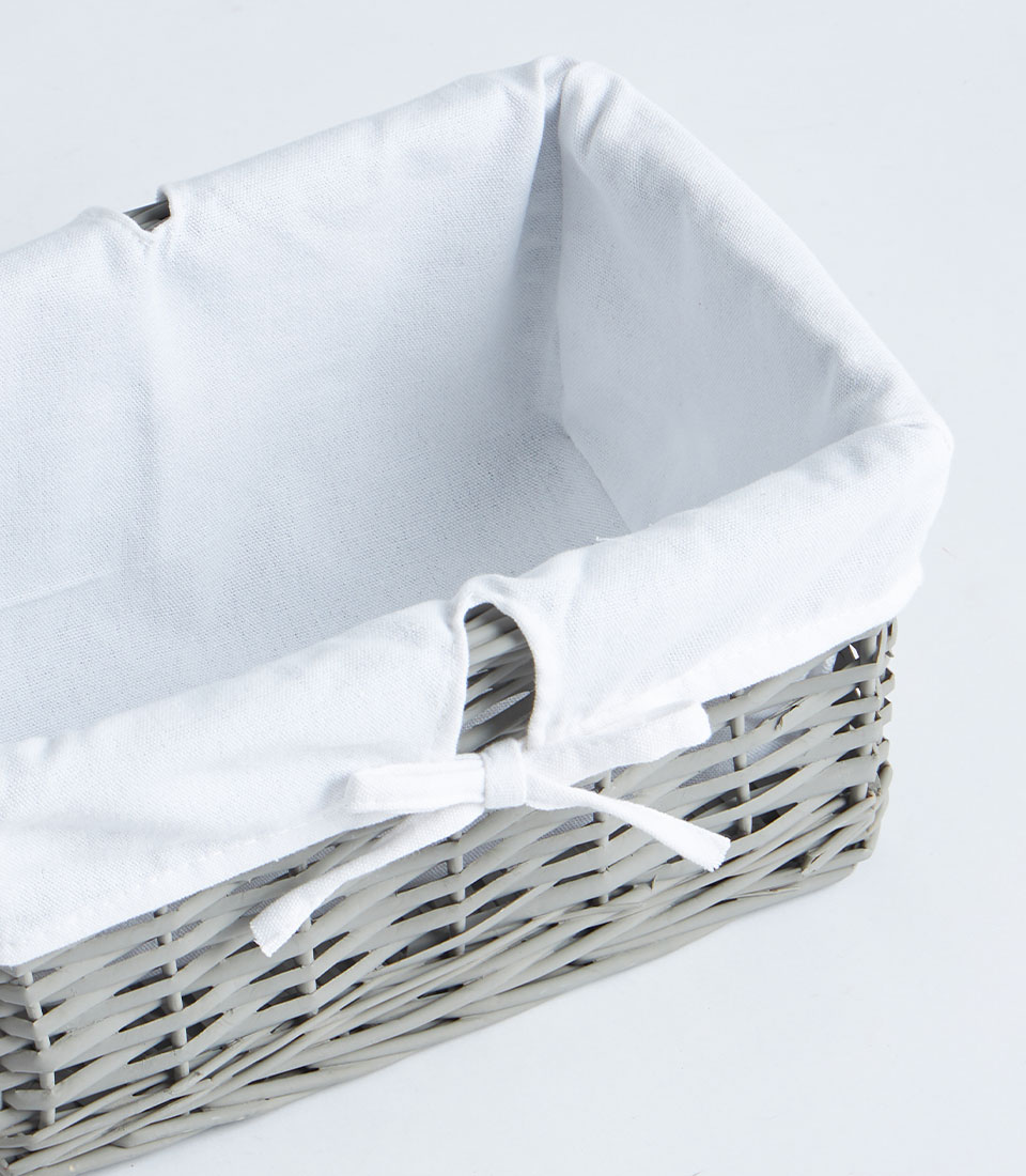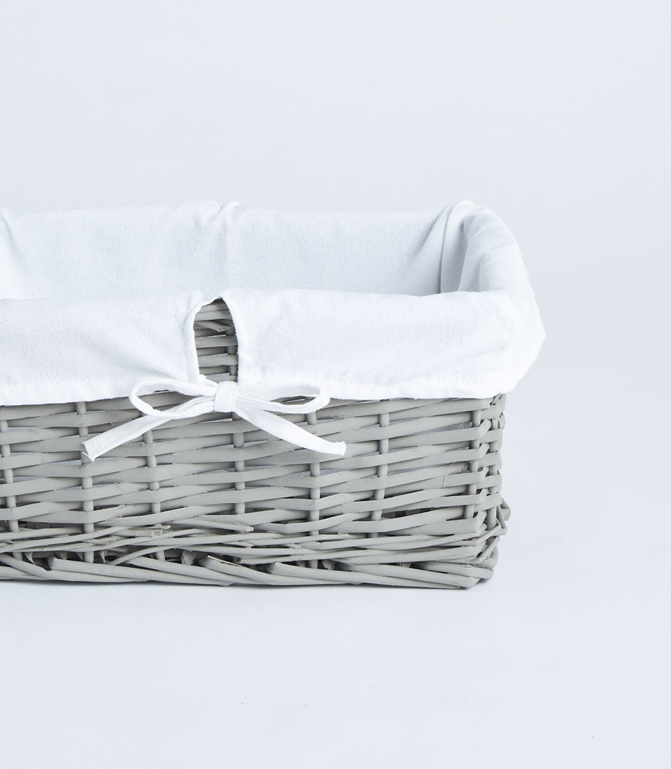 This rectangular wicker basket showcases a light grey woven exterior complemented by a soft fabric liner. The clean and structured silhouette offers a balanced and contemporary presentation suitable for curated gifting.