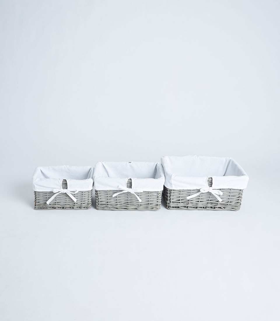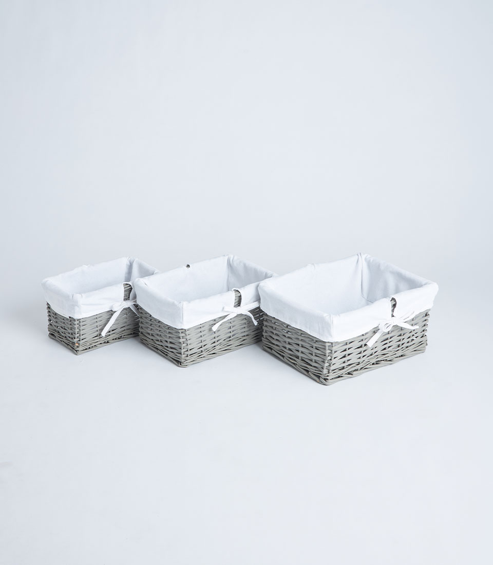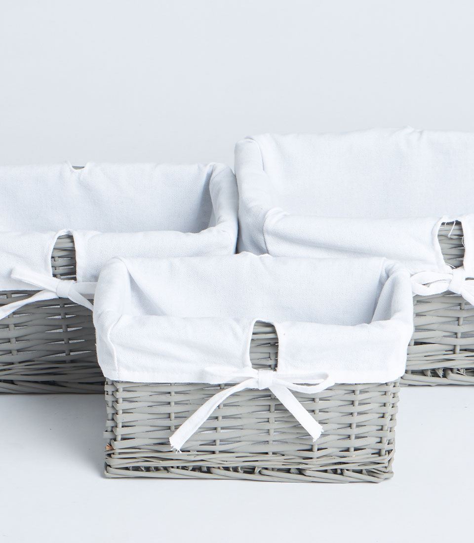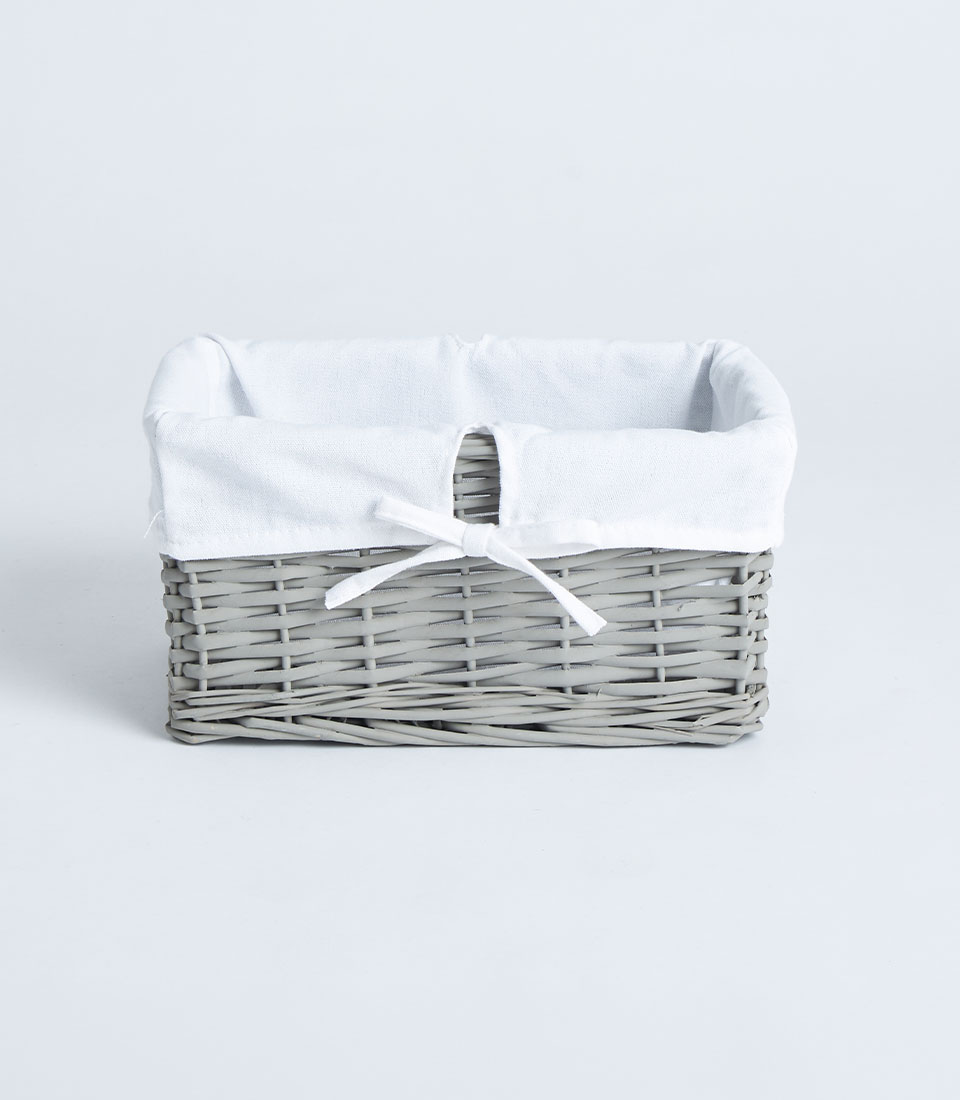 This rectangular wicker basket showcases a light grey woven exterior complemented by a soft fabric liner. The clean and structured silhouette offers a balanced and contemporary presentation suitable for curated gifting.
