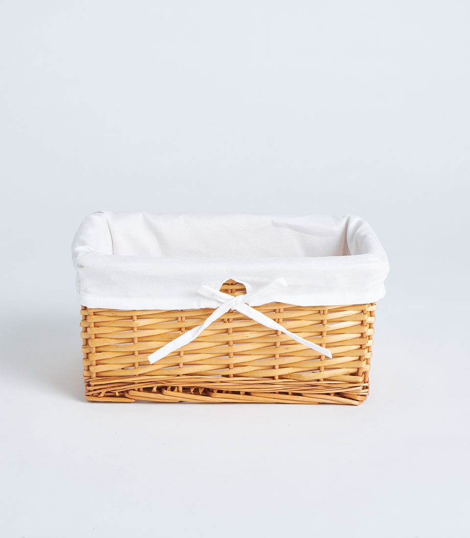 A handwoven rectangular wicker basket in a natural finish, complete with a removable soft linen liner and decorative front tie detail. Designed as a versatile and structured base for fruit hampers, baby gifts, and curated seasonal collections.