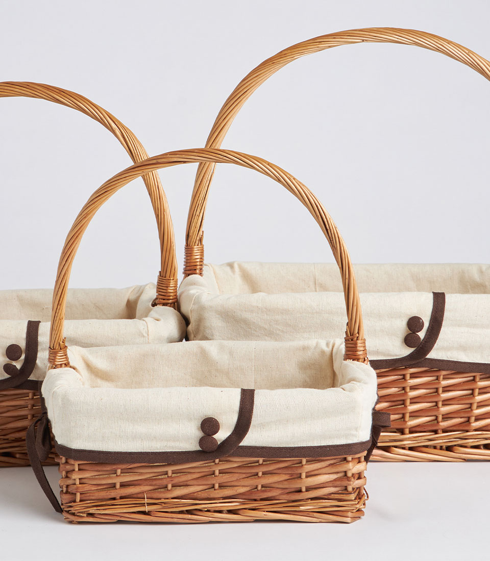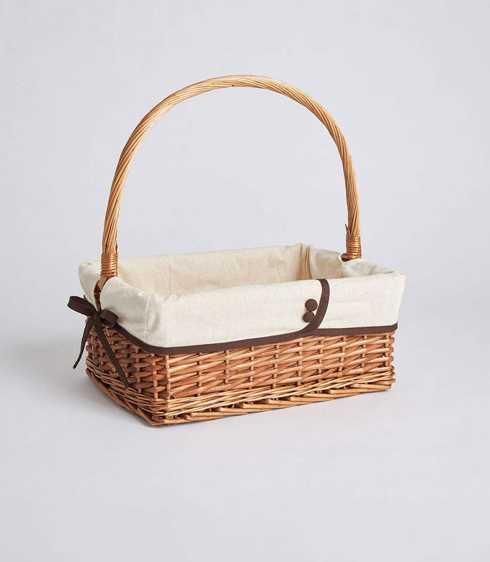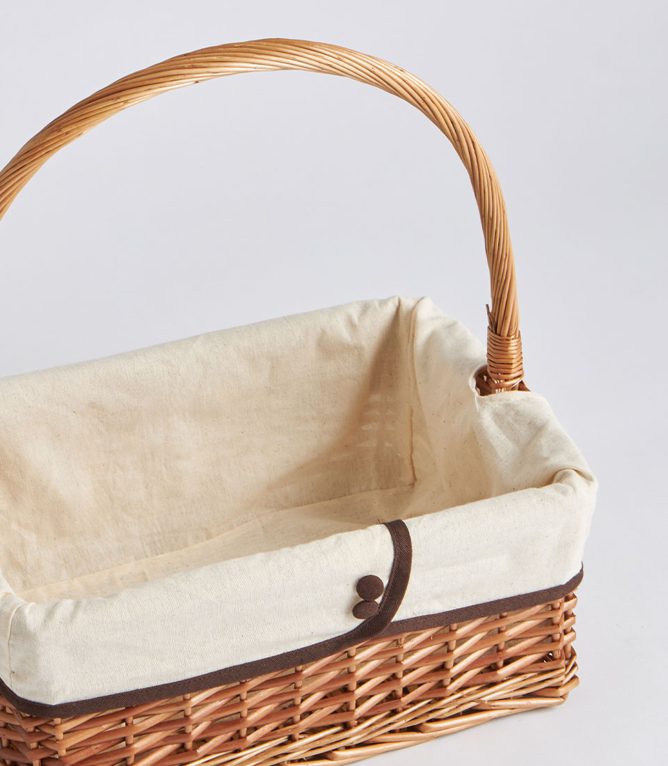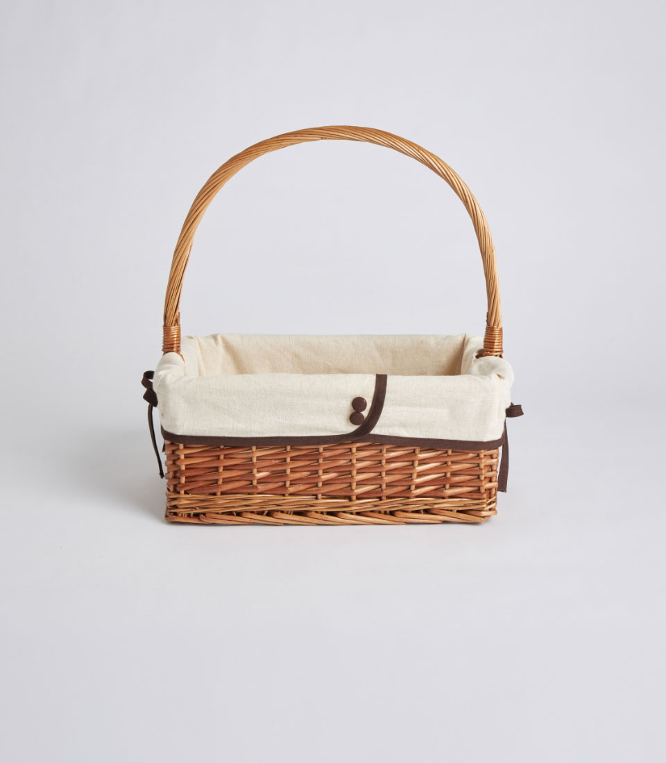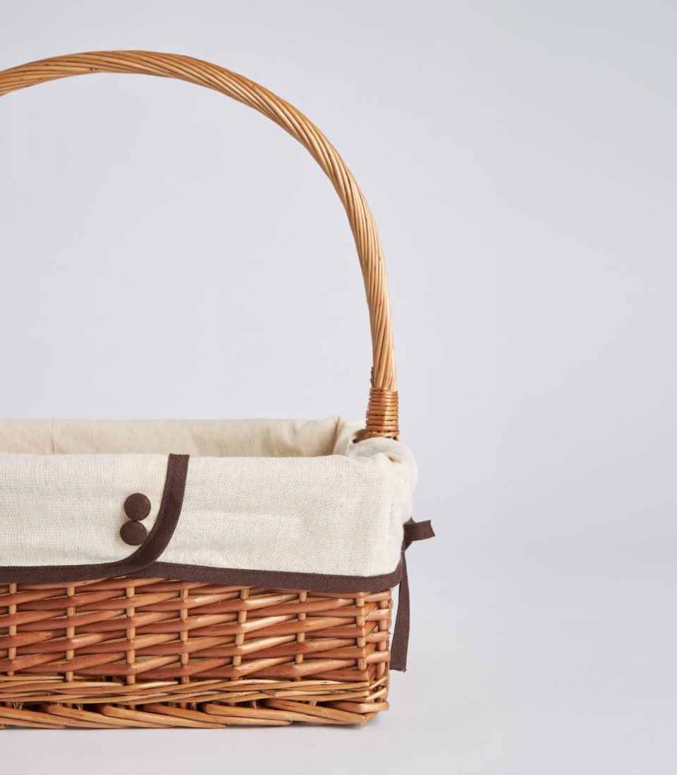 A handwoven rectangular wicker basket featuring a tall arched handle and removable fabric lining. Designed as a versatile and elegant base for fruit hampers, festive gifting, and curated corporate presentations.
