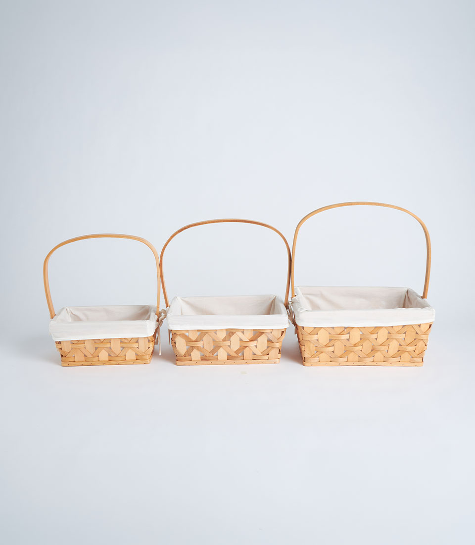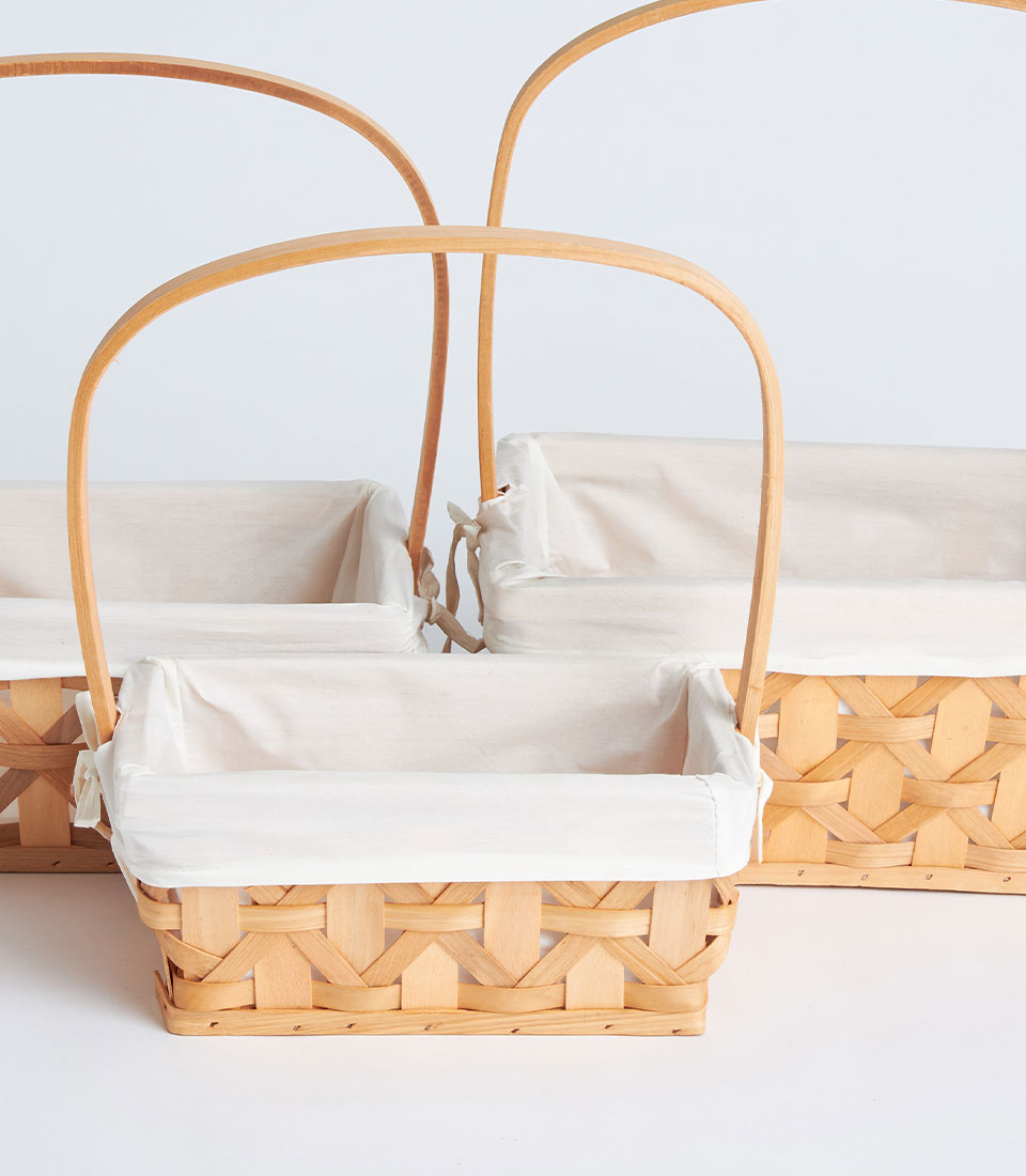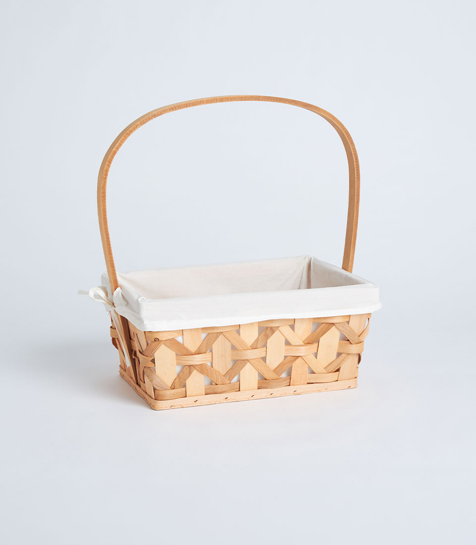 This rectangular wicker basket showcases a natural woven exterior complemented by a tall arched handle and soft fabric lining. The elevated handle enhances both presentation and functionality while maintaining a clean and timeless silhouette.