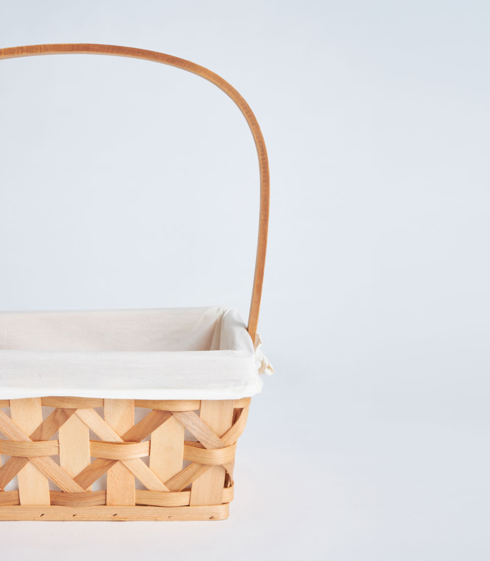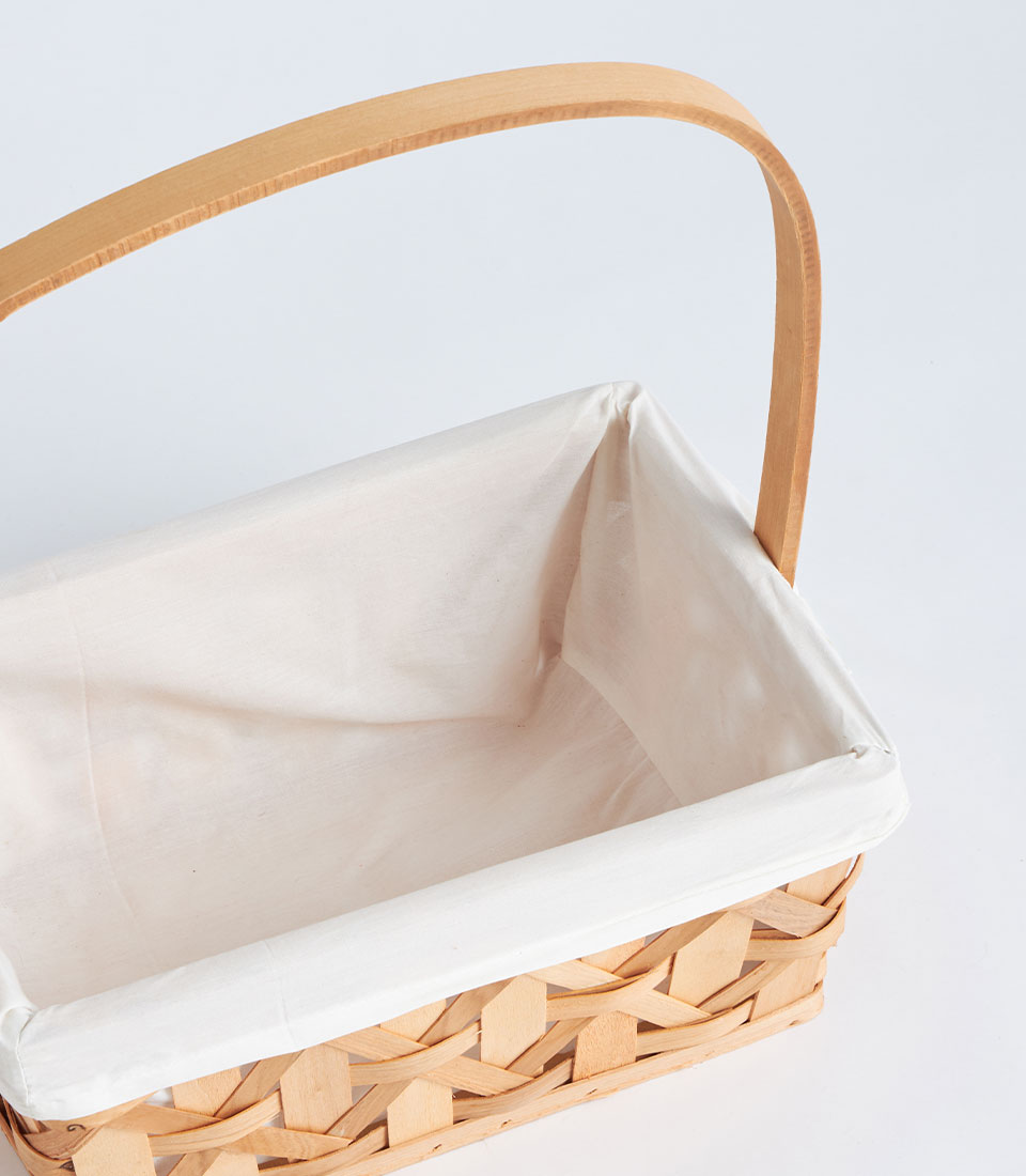 A handwoven rectangular wicker basket featuring a tall structured handle and removable fabric lining. Designed as a refined and elegant base for premium hampers, festive gifting, and curated corporate presentations.
